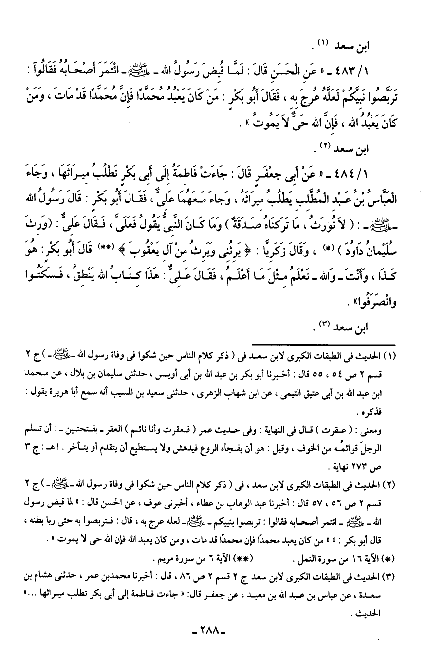 1/ 484 - "عَنْ أَبِى جعْفَرٍ قَالَ: جَاءَتْ فَاطِمَةُ إِلَى أَبِى بَكْرٍ تَطْلُبُ مِيرَاثَهَا، وَجَاءَ الْعَبَّاسُ بْنُ عَبْدِ الْمُطَّلِبِ يَطْلُبُ مِيرَاثَهُ، وَجاءَ مَعَهُمَا عَلِىٌّ، فَقَالَ أَبُو بَكْرٍ: قَالَ رَسُولُ الله - صلى الله عليه وسلم -: (لَا نُورَثُ، مَا تَرَكنَاهُ صَدَقَةٌ) وَمَا كَانَ النَّبِىُّ يَقُولُ فَعَلَىَّ، فَقَالَ عَلِىٌّ: (وَرِثَ سُلَيْمانُ دَاوُدَ) (*)، وَقَالَ زَكَرِيَّا: {يَرِثُنِي وَيَرِثُ مِنْ آلِ يَعْقُوبَ} (* *) قَالَ أَبُو بَكْرْ هُوَ كَذَا، وَأَنْتَ - وَالله - تَعْلَمُ مِثْلَ مَا أَعْلَمُ، فَقَالَ عَلِىٌّ: هَذَا كِتَابُ الله يَنْطِقُ، فَسَكَتُوا وانْصَرَفُوا".