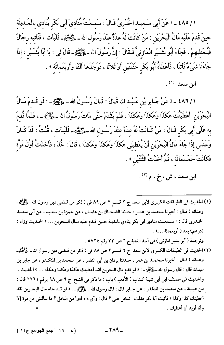 1/ 485 - "عَنْ أَبِى سَعِيدٍ الخُدْرِىِّ قَالَ: سَمِعْتُ مُنَادِىَ أَبِى بَكْرٍ يُنَادِى بِالْمَدِينَةِ حِينَ قَدِمَ عَلَيْهِ مَالُ الْبَحْرَيْنِ: مَنْ كَانَتْ لَهُ عِدَةٌ عِنْدَ رَسُولِ الله - صلى الله عليه وسلم - فَلْيَأت، فَتَأتِيهِ رِجَالٌ فَيُعْطِيهِمْ، فَجَاءَ أَبُو بُشَيْرٍ الْمَازِنِىُّ فَقَالَ: إِنَّ رَسُولَ الله - صلى الله عليه وسلم - قَالَ لِى: يَا أَبَا بُشَيْرٍ: إِذَا جَاءَنَا شَىْءٌ فَأتِنَا، فَأَعْطَاهُ أَبُو بَكْرٍ حَفْنَتَيْنِ أَوْ ثَلَاثًا، فَوَجَدَهَا أَلْفًا وَأَربَعَمِائَةٍ".