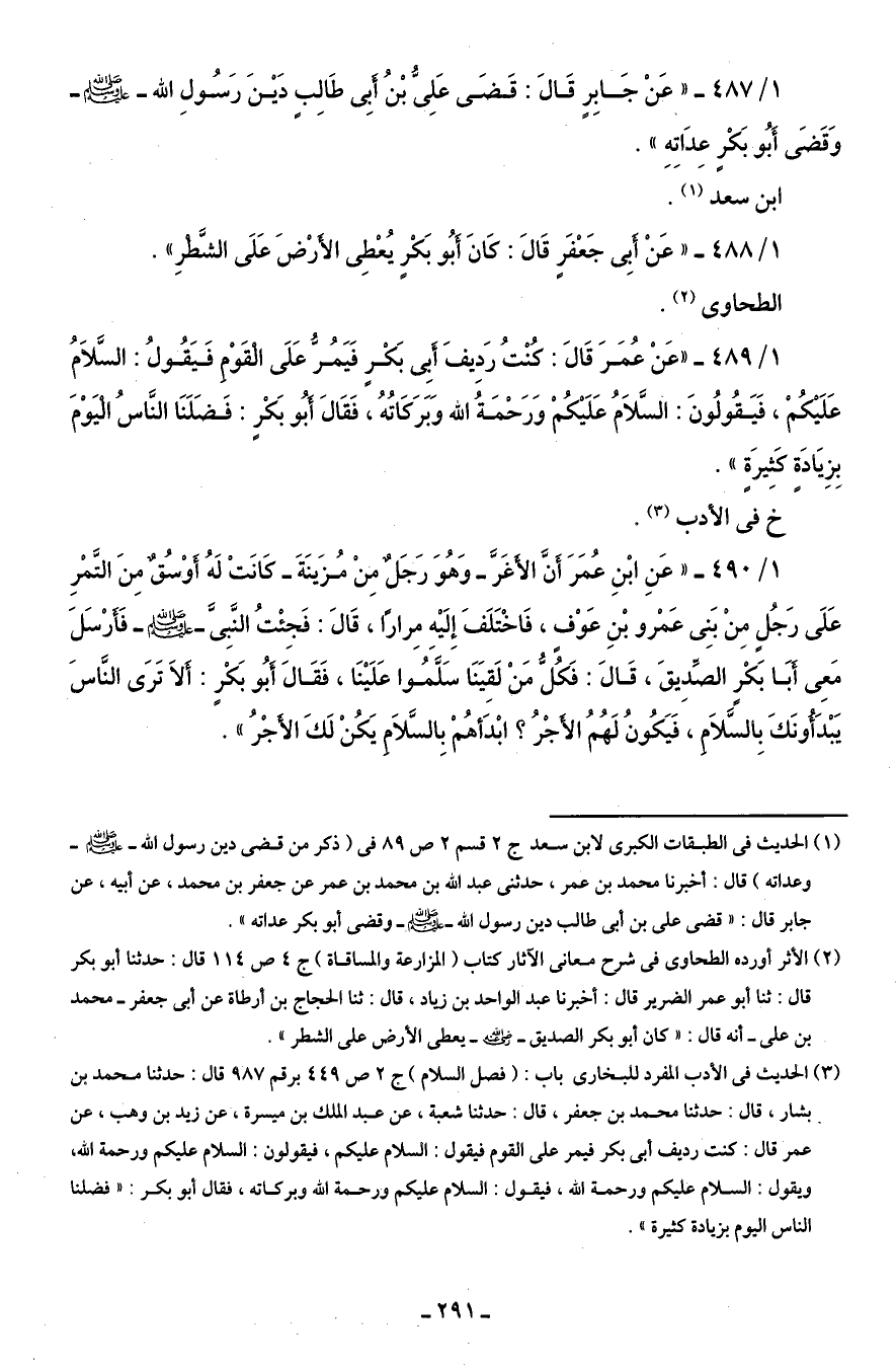1/ 489 - "عَنْ عُمَرَ قَالَ: كُنْتُ رَدِيفَ أَبِى بَكْرٍ فَيَمُرُّ عَلَى الْقَوْمِ فَيَقُولُ: السَّلَامُ عَلَيْكُمْ، فَيَقُولُونَ: السَّلَامُ عَلَيْكُمْ وَرَحْمَةُ الله وَبَرَكَاتُهُ، فَقَالَ أَبُو بَكْرٍ: فَضَلَنَا النَّاسُ الْيَوْمَ بِزِيَادَةٍ كثِيرَةٍ".