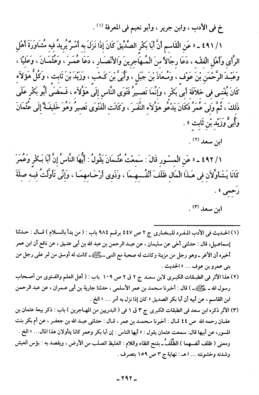 1/ 492 - "عَنِ الْمِسْورِ قَالَ: سَمِعْتُ عُثْمَانَ يَقُولُ: أَيُّهَا النَّاسُ إِنَّ أَبَا بَكْرٍ وَعُمَرَ كَانَا يَتَأوَّلَانِ في هَذَا الْمَاَلِ ظَلَفَ أَنْفُسِهِمَا، وَذَوِى أَرْحَامِهِمَا، وَإِنِّى تَأَوَّلْتُ فِيهِ صِلَةَ رَحِمِى".