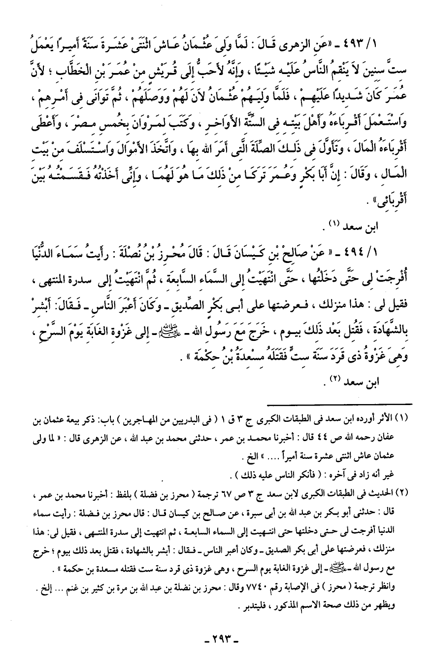 1/ 493 - "عَنِ الزهرى قَالَ: لَمَّا وَلِىَ عُثْمَانُ عَاشَ اثْنَتَىْ عَشَرةَ سَنَةً أَمِيرًا يَعْمَلُ سِتَّ سِنِينَ لَا يَنْقِمُ النَّاسُ عَلَيْهِ شَيْئًا، وَإِنَّهُ لأَحَبُّ إِلَى قُرَيْشٍ مِنْ عُمَرَ بْنِ الْخَطَّابِ؛ لأَنَّ عُمَرَ كَانَ شَدِيدًا عَلَيْهِمْ، فَلَمَّا وَلِيَهُمْ عُثْمَانُ لَانَ لَهُمْ وَوَصَلَهُمْ، ثُمَّ تَوَانَى في أَمْرِهِمْ، وَاسْتَعْمَلَ أَقْرِبَاءَهُ وَأَهْلَ بَيْتِهِ في السِّتَّةِ الأَوَاخِرِ، وَكَتَبَ لِمَرْوَانَ بِخُمسِ مِصْرَ، وَأَعْطَى أَقْرِبَاءَهُ الْمَالَ، وَتَأَوَّلَ في ذَلِكَ الصِّلَةَ الَّتِى أَمَرَ الله بِهَا، وَاتَّخَذَ الأَمْوَالَ وَاسْتَسْلَفَ مِنْ بَيْتِ الْمَالِ، وَقَالَ: إِنَّ أَبَا بَكْرٍ وَعُمَرَ تَرَكَا مِنْ ذَلِكَ مَا هُوَ لَهُمَا، وَإِنِّى أَخَذْتُهُ فَقَسَمْتُهُ بَيْنَ أَقْرِبَائِى".
