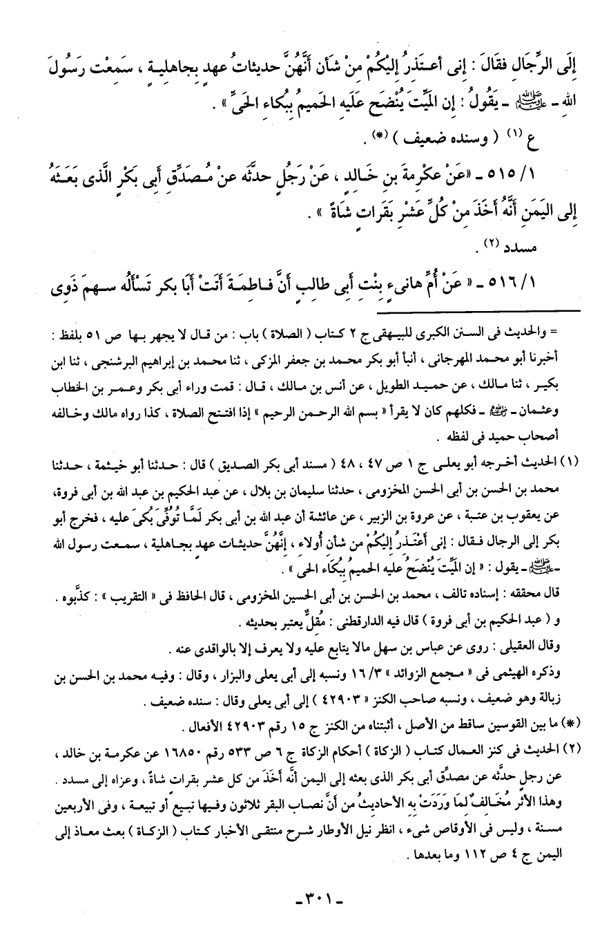 (¬2) الحديث في كنز العمال كتاب (الزكاة) أحكام الزكاة ج 6 ص 533 رقم 16850 عن عكرمة بن خالد، عن رجلٍ حدَّثه عن مصدِّق أبي بكر الذى بعثه إلى اليمن أنَّه أَخَذَ من كل عشر بقراتٍ شاةً، وعزاه إلى مسدد. وهذا الأثر مُخَالِفٌ لِمَا وَرَدَتْ بِهِ الأحاديِثُ من أَنَّ نصاب البقر ثلاثون وفيها تبيع أو تبيعة، وفى الأربعين مسنة، وليس في الأوقاص شئ، انظر نيل الأوطار شرح منتقى الأخبار كتاب (الزكاة) بعث معاذ إلى اليمن ج 4 ص 112 وما بعدها.