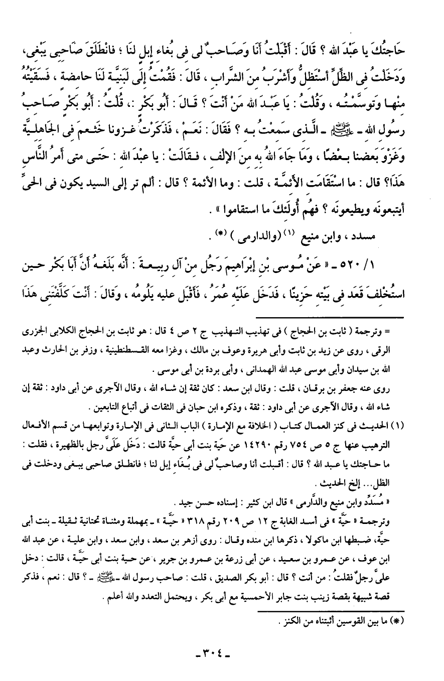 (¬1) الحديث في كنز العمال كتاب (الخلافة مع الإمارة) الباب الثاني في الإمارة وتوابعها من قسم الأفعال الترهيب عنها ج 5 ص 754 رقم 14290 عن حَية بنت أبى حيَّة قالت: دَخَل عَلَىَّ رجل بالظهيرة، فقلت: ما حاجتك يا عبد الله؟ قال: أقبلت أنا وصاحبٌ لى في بُغَاءِ إبل لنا؛ فانطلق صاحبى يبغى ودخلت في الظل ... إلخ الحديث.