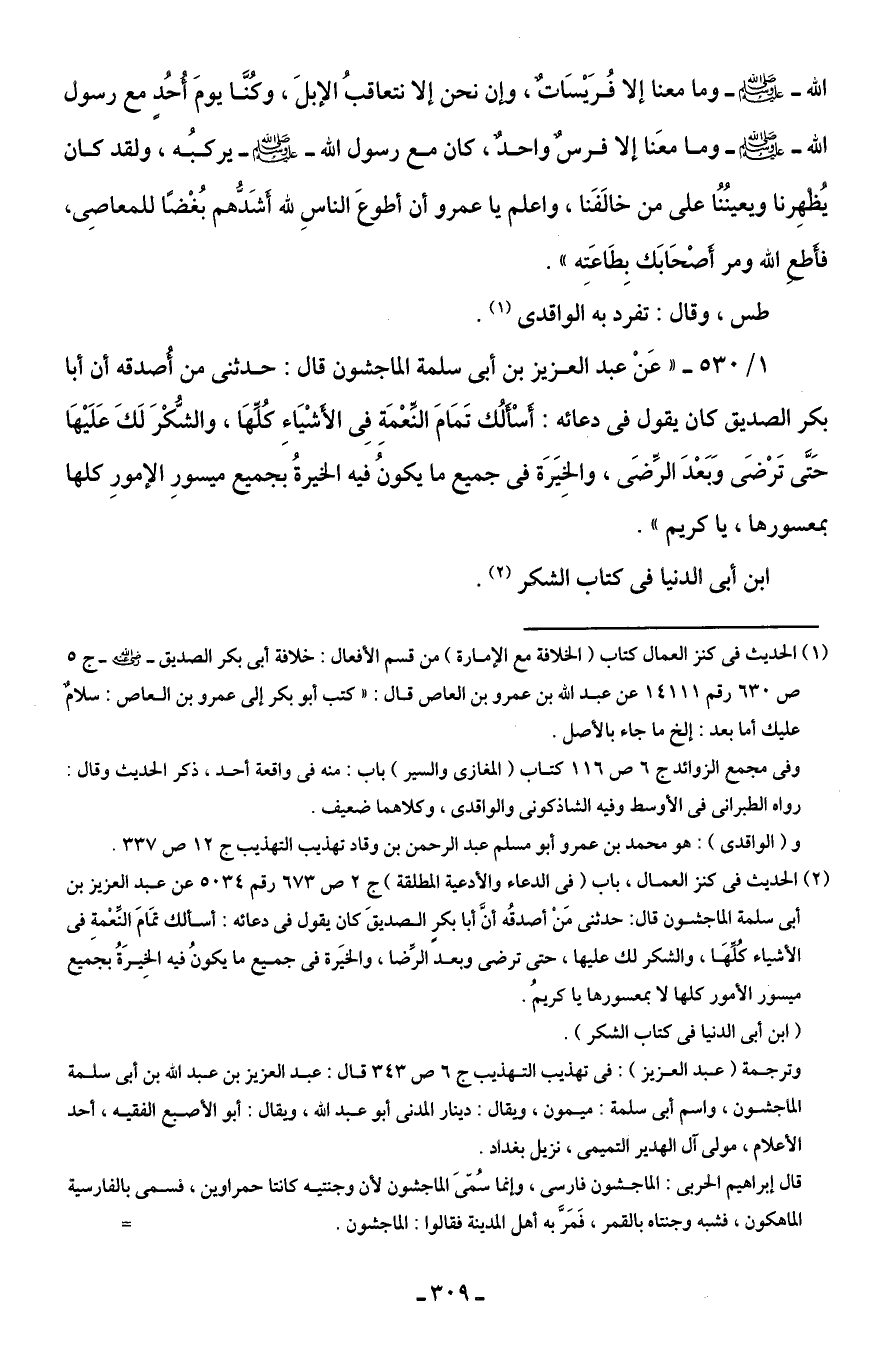 (¬2) الحديث في كنز العمال، باب (في الدعاء والأدعية المطلقة) ج 2 ص 673 رقم 5034 عن عبد العزيز بن أبى سلمة الماجشون قال: حدثنى مَنْ أصدقُه أنَّ أبا بكرٍ الصديق كان يقول في دعائه: أسألك تمَامَ النِّعْمةِ في الأشياء كُلِّهَا، والشكر لك عليها، حتى ترضى وبعد الرِّضا، والخيَرة في جميع ما يكونُ فيه الخِيرَةُ بجميع ميسور الأمور كلها لا بمعسورها يا كريمُ.