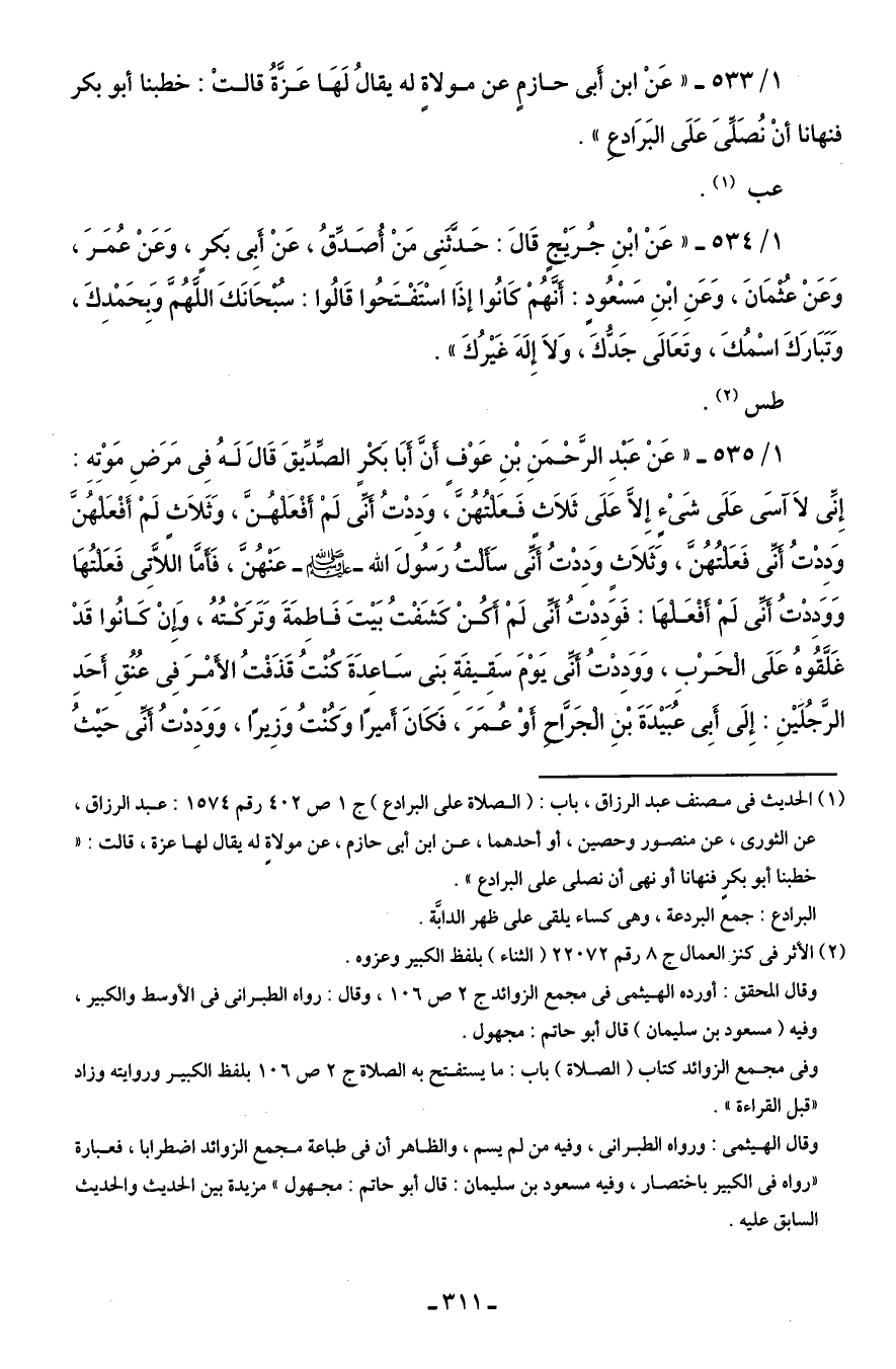 1/ 533 - "عَنْ ابن أَبى حازمٍ عن مولاةٍ له يقالُ لَهَا عَزَّةُ قالتْ: خطبنا أبو بكر فنهانا أنْ نُصَلِّىَ عَلَى البَرَادعِ".