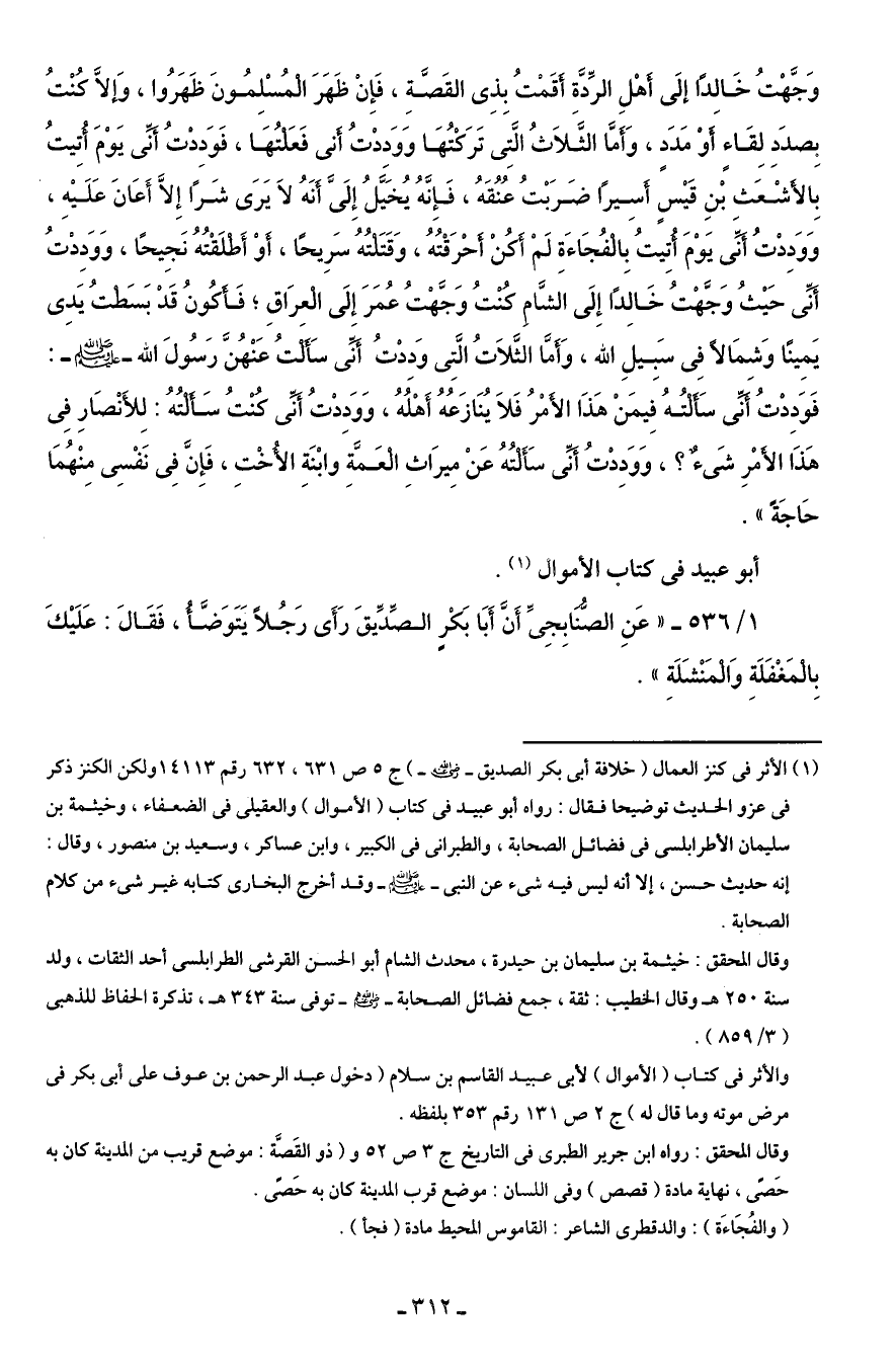 (¬1) الأثر في كنز العمال (خلافة أبى بكر الصديق - رضي الله عنه -) ج 5 ص 631، 632 رقم 14113 ولكن الكنز ذكر في عزو الحديث توضيحا فقال: رواه أبو عبيد في كتاب (الأموال) والعقيلى في الضعفاء, وخيثمة بن سليمان الأطرابلسى في فضائل الصحابة، والطبرانى في الكبير، وابن عساكر، وسعيد بن منصور، وقال: إنه حديث حسن، إلا أنه ليس فيه شئ عن النبى - صلى الله عليه وسلم - وقد أخرج البخارى كتابه غير شئ من كلام الصحابة.