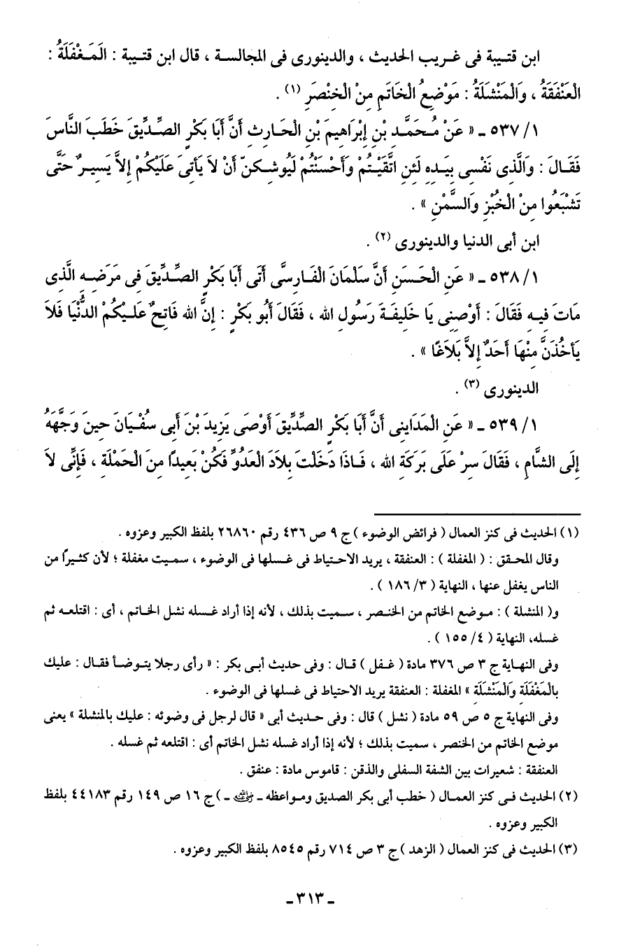 1/ 538 - "عَنِ الْحَسَنِ أنَّ سَلْمَانَ الْفَارِسى أَتَى أبَا بَكْرٍ الصِّدَّيقَ في مَرَضِه الَّذِى مَاتَ فيهِ فَقَالَ: أَوْصِنِى يَا خَلِيفَةَ رَسُولِ الله، فَقَالَ أبُو بَكْرٍ: إِنَّ الله فَاتِحٌ عَليْكُمْ الدُّنْيَا فَلَا يَأخُذَنَّ مِنْهَا أَحَدٌ إِلَّا بَلَاغًا".