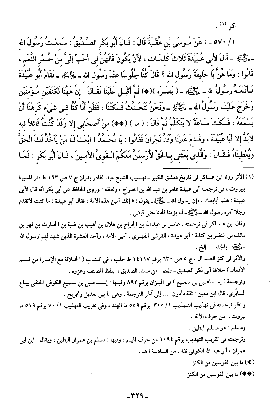 1/ 570 - "عَنْ مُوسَى بْنِ عُقْبَةَ قَالَ: قَالَ أَبُو بَكْرِ الصِّدَّيقُ: سَمِعْتُ رَسُولَ اللهِ - صلى الله عليه وسلم - قَالَ لأَبِى عُبَيْدَةَ ثَلاثَ كَلِمَاتٍ، لأَنْ يَكونَ قَالَهُنَّ لِى أحَبّ إلَىَّ مِنْ حُمْرِ النَّعَمِ، قَالُوا: وَمَا هنَّ يا خَلِيفَةَ رَسُولِ اللهِ؟ قَالَ كُنَّا جُلُوسًا عِنْدَ رَسُولِ اللهِ - صلى الله عليه وسلم - فَقَامُ أَبُو عُبَيْدَةَ فَأَتْبَعَهُ رسُولُ اللهِ - صلى الله عليه وسلم - (بَصَرَه) (*) ثُمَّ أقْبَلَ عَلَيْنَا فَقَالَ: إِنَّ هَهُنَا لَكَنَفَيْنِ مُؤْمِنَيْن وَخَرجَ عَلَيْنَا رَسُولُ الله - صلى الله عليه وسلم - وَنَحْنُ نَتَحَدَّثُ فَسَكَتْنَا، فَظَنَّ أنَّا كنَّا في شَىْءٍ كَرِهْنَا أَنْ يَسْمَعَهُ، فَسَكَتَ سَاعَةً لا يَتَكَلَّمُ ثُم قَالَ: (ما) (* *) مِنْ أَصحَابِى إِلا وَقَدْ كُنتُ قَائِلًا فِيهِ لا بُدَّ إِلا أَبَا عُبَيْدَةَ، وقَدِمَ عَلَيْنَا وَفَدُ نَجْرانَ فَقَالُوا: يَا مُحَمَّدُ! ابْعَثْ لَنَا مَنْ يَأَخُذُ لَكَ الْحَقَّ وَيُعْطِينَاهُ فَقَالَ: وَالَّذِى بَعَثَنِى بِالحَقِّ لأُرْسِلَنَّ مَعَكُمْ الْقَوِىَّ الأَمِينَ، قَالَ أَبُو بَكْرٍ: فَمَا