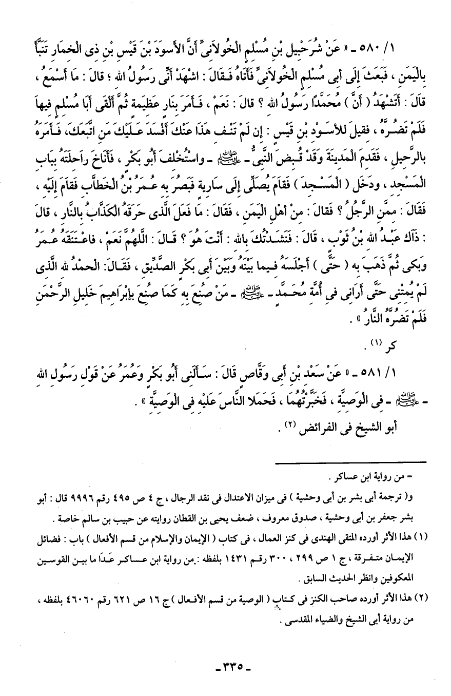 1/ 581 - "عَنْ سَعْدِ بْنِ أبِى وَقَّاصٍ قَالَ: سَأَلَنِى أبُو بَكْرٍ وَعُمَرُ عَنْ قَوْلِ رَسُولِ اللهِ - صلى الله عليه وسلم - فِى الْوَصِيَّةِ، فَخَبَّرْتُهُمَا، فَحَمَلا النَّاسَ عَليْهِ فِى الْوَصِيَّةِ".