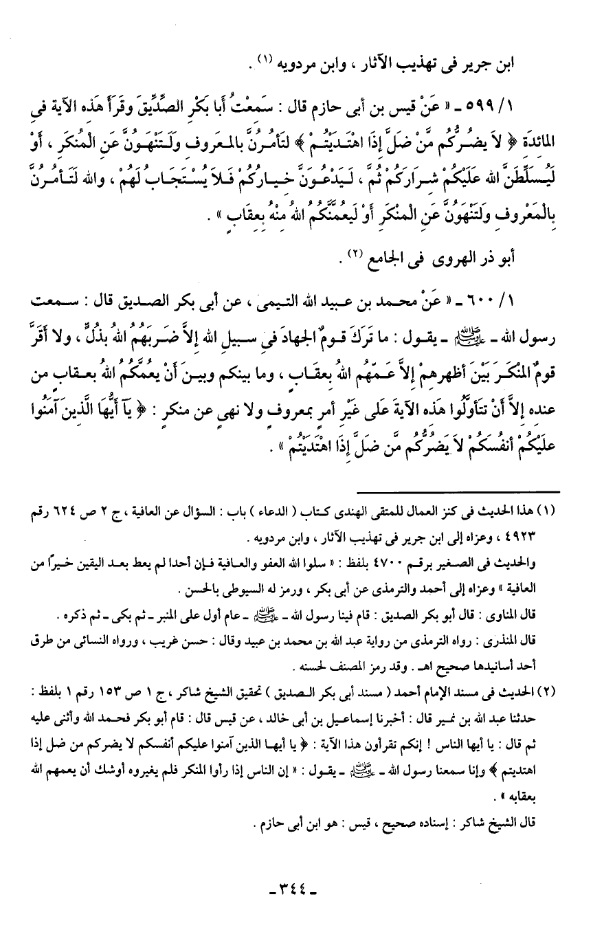 1/ 599 - "عَنْ قيس بن أبى حازم قال: سَمِعْت أَبا بَكْرِ الصِّدِّيقَ وقَرَأَ هَذِه الآية فِى المائِدَةِ {لَا يَضُرُّكُمْ مَنْ ضَلَّ إِذَا اهْتَدَيْتُمْ} لتَأمُرُنَّ بالمعَروفِ وَلَتَنْهَوُنَّ عَنِ الْمُنكَرِ، أَوْ لَيُسَلِّطَنَّ الله عَلَيْكُمْ شِرَارَكُمْ ثُمَّ، لَيَدْعُوَنَّ خِيارُكُمْ فَلَا يُسْتَجَابُ لَهُمْ، والله لَتَأمُرُنَّ بِالْمَعْروفِ وَلتَنْهَوُنَّ عَنِ الْمنْكَرِ أَوْ لَيعُمَّنَّكُمُ اللهُ مِنْهُ بِعِقَابٍ".