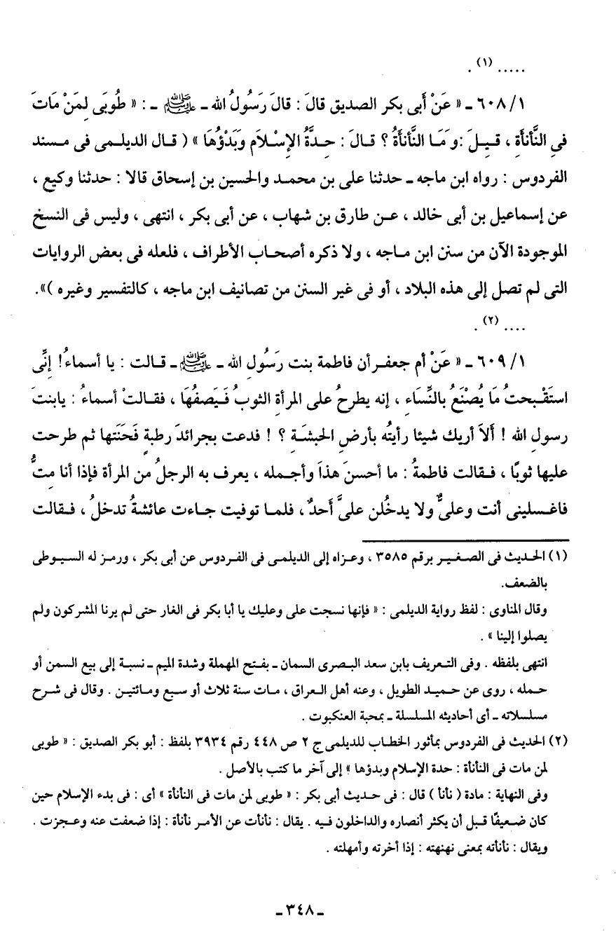 1/ 608 - "عَنْ أَبى بكر الصديق قالَ: قالَ رَسُولُ الله - صلى الله عليه وسلم -: "طُوبَى لِمَنْ مَاتَ فِى النَّأنأَةِ، قِيلَ: وَمَا النَّأنأَةُ؟ قالَ: حِدَّةُ الإِسْلَام وَبَدْؤُهَا" (قال الديلمى في مسند الفردوس: رواه ابن ماجه - حدثنا على بن محمد والحسين بن إسحاق قالا: حدثنا وكيع، عن إسماعيل بن أبى خالد، عن طارق بن شهاب، عن أبى بكر، انتهى، وليس في النسخ الموجودة الآن من سنن ابن ماجه، ولا ذكره أصحاب الأطراف، فلعله في بعض الروايات التى لم تصل إلى هذه البلاد، أو في غير السنن من تصانيف ابن ماجه، كالتفسير وغيره) ".