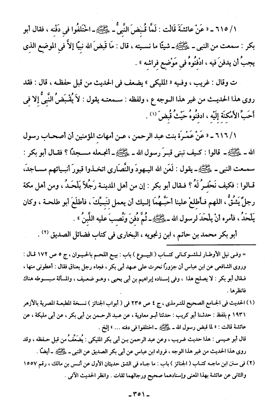 (¬1) الحديث في الجامع الصحيح للترمذى، ج 4 ص 235 في (أبواب الجنائز) نسخة المطبعة المصرية بالأزهر 1931 م بلفظ: حدثنا أبو كريب: حدثنا أبو معاوية، عن عبد الرحمن بن أبى بكر، عن أبى مليكة، عن عائشة قالت: "لما قبض رسول الله - صلى الله عليه وسلم - اختلفوا في دفنه ... " إلخ.