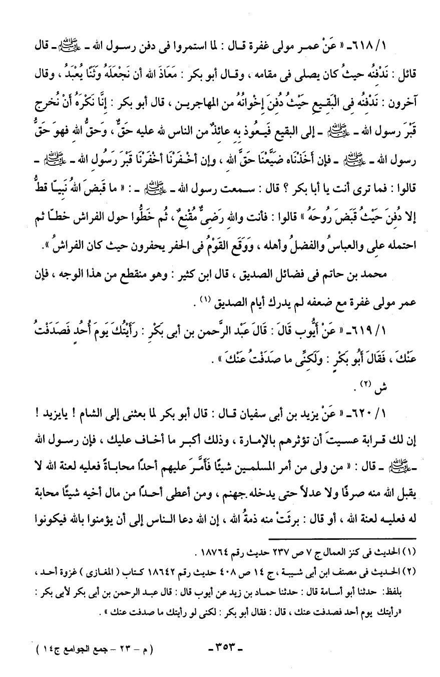 1/ 619 - "عَنْ أَيُّوب قَالَ: قَالَ عَبْد الرَّحمن بن أبى بَكْرِ: رَأَيْتُكَ يَومَ أُحُدٍ فَصَدَفْتُ عَنْكَ، فَقَالَ أَبُو بَكْرٍ: وَلَكِنِّى ما صَدَفْتُ عَنْكَ".