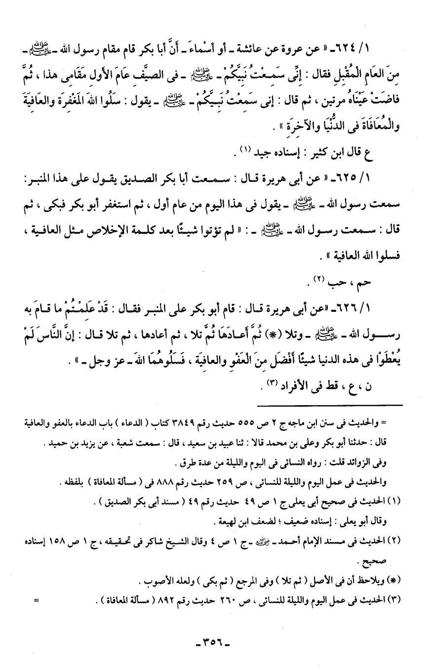 1/ 624 - "عن عروة عن عائشة- أو أسْماءَ - أَنَّ أبا بكر قام مقام رسول الله - صلى الله عليه وسلم - مِنَ العَامِ الْمُقْبِلِ فقال: إِنِّى سَمِعْت نَبِيَّكُمْ - صلى الله عليه وسلم - في الصيَّفِ عَامَ الأَولِ مَقَامِى هذا، ثُمَّ فاضَتْ عَيْنَاهُ مرتين، ثم قال: إنى سَمِعْتُ نَبِيَّكُمْ - صلى الله عليه وسلم - يقول: سَلُوا اللهَ المَغْفِرَة والعَافِيَةَ والْمُعَافَاةَ في الدُّنْيَا والآخِرَةِ".