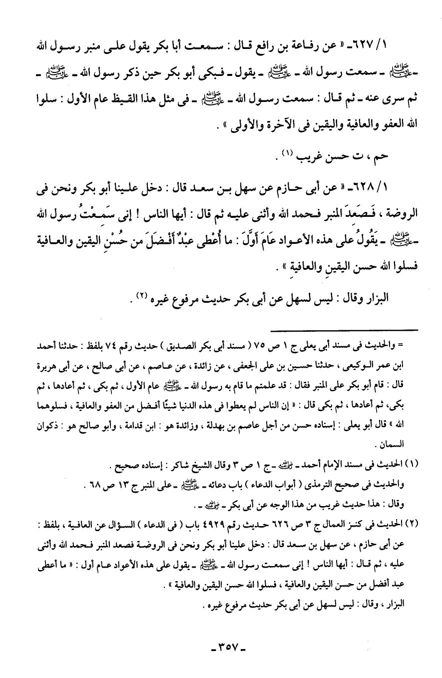 1/ 627 - "عن رفاعة بن رافع قال: سمعت أبا بكر يقول على منبر رسول الله - صلى الله عليه وسلم - سمعت رسول الله - صلى الله عليه وسلم - يقول - فبكى أبو بكر حين ذكر رسول الله - صلى الله عليه وسلم - ثم سرى عنه - ثم قال: سمعت رسول الله - صلى الله عليه وسلم - في مثل هذا القيظ عام الأول: سلوا الله العفو والعافية واليقين في الآخرة والأولى".