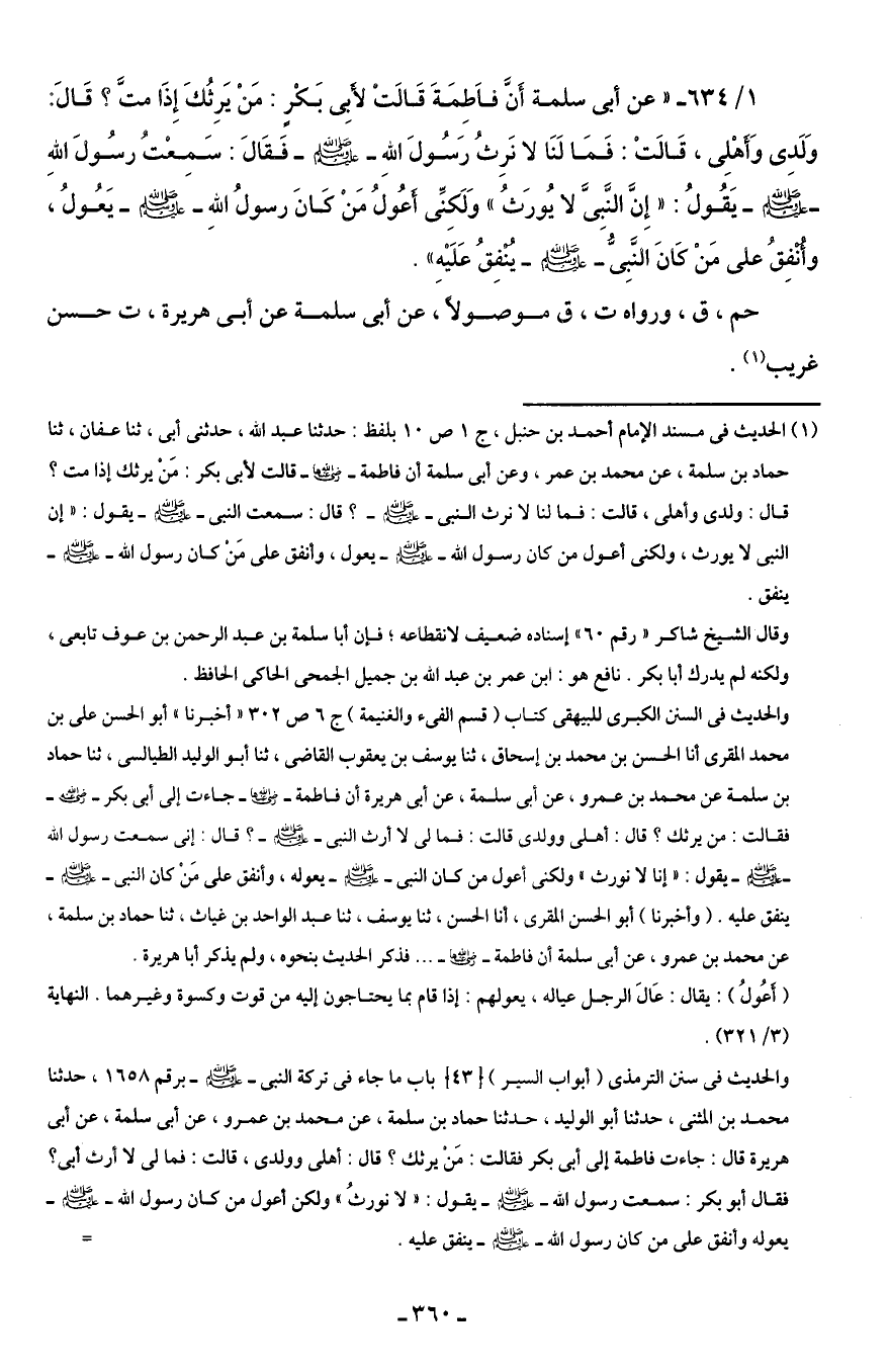 1/ 634 - "عن أبى سلمة أَنَّ فَاطِمَةَ قَالَتْ لأَبى بَكْرٍ: مَن يَرِثُكَ إِذَا متَّ؟ قَالَ: وَلَدى وَأَهْلِى، قَالَتْ: فَمَا لَنَا لا نَرِثُ رَسُولَ اللهِ - صلى الله عليه وسلم - فَقَالَ: سَمِعْت رسُول اللهِ - صلى الله عليه وسلم - يَقُولُ: "إِنَّ النَّبِىَّ لا يُورَثُ" وَلَكِنِّى أَعُولُ مَنْ كَانَ رسولُ اللهِ - صلى الله عليه وسلم - يَعُولُ، وأُنْفِقُ على مَن كَانَ النَّبِىُّ - صلى الله عليه وسلم - يُنْفِقُ عَلَيْهِ".