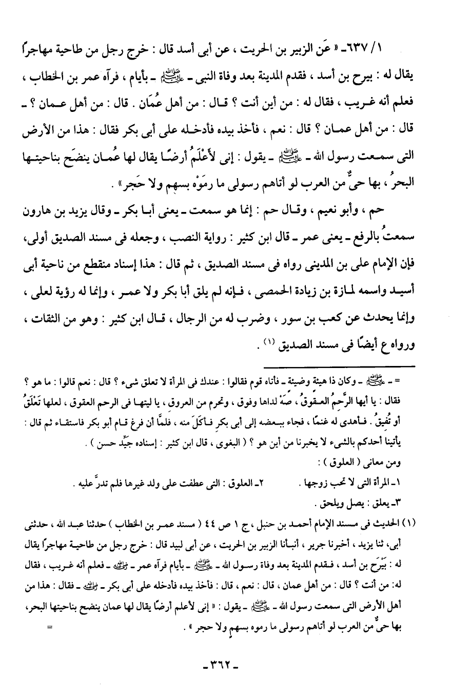 1/ 637 - "عَن الزبير بن الحريت، عن أبى أسد قال: خرج رجل من طاحية مهاجرًا يقال له: بيرح بن أسد، فقدم المدينة بعد وفاة النبى - صلى الله عليه وسلم - بأيام، فرآه عمر بن الخطاب، فعلم أنه غريب، فقال له: من أين أنت؟ قال: من أهل عُمَان. قال: من أهل عمان؟ - قال: من أهل عمان؟ قال: نعم، فأخذ بيده فأدخله على أبى بكر فقال: هذا من الأرض التى سمعت رسول الله - صلى الله عليه وسلم - يقول: إنى لأَعْلَمُ أرضًا يقال لها عُمان ينضَح بناحيتها البحرُ، بها حىٌّ من العرب لو أتاهم رسولى ما رمَوْه بسهم ولا حَجر".