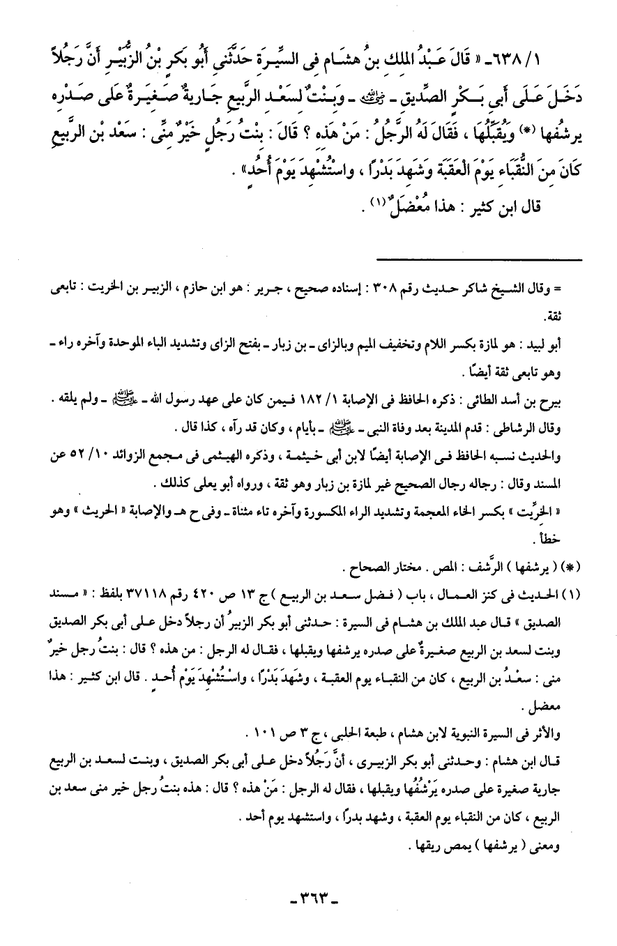 1/ 638 - "قَالَ عَبْدُ الملِكِ بنُ هشَام فِى السِّيرَةِ حَدَّثَنِى أَبُو بَكرٍ بْنُ الزُّبَيْرِ أَنَّ رَجُلًا دَخَلَ عَلَى أَبىِ بَكْرٍ الصِّديقِ - رضي الله عنه - وَبِنْتٌ لِسَعْدِ الرَّبيعِ جَاريةٌ صَغِيَرةٌ عَلى صَدْرِه يرشُفها (*) وَيُقبِّلُهَا، فَقَالَ لَهُ الرَّجُلُ: مَنْ هَذِهِ؟ قَالَ: بِنْتُ رَجُلٍ خَيْرٌ مِنِّى: سَعْد بْن الرَّبيعِ كَانَ مِنَ النُّقَبَاءِ يَوْمَ الْعَقَبَة وَشَهِدَ بَدْرًا، واسْتُشْهِدَ يَوْمَ أُحُدٍ".