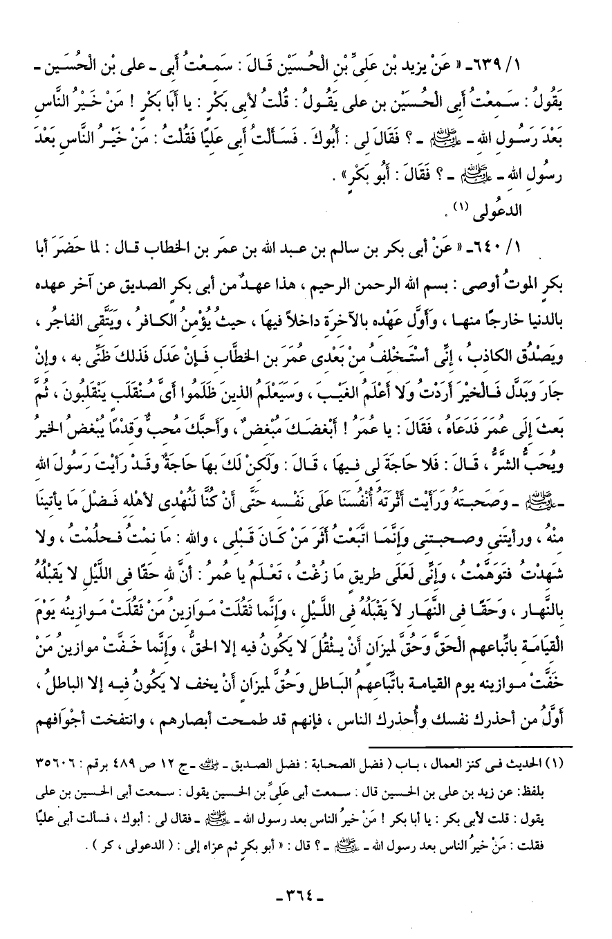 (¬1) الحديث في كنز العمال، باب (فضل الصحابة: فضل الصديق - رضي الله عنه - ج 12 ص 489 برقم: 35606 بلفظ: عن زيد بن على بن الحسين قال. سمعت أبى عَلِىِّ بن الحسين يقول: سمعت أبى الحسين بن على يقول: قلت لأبى بكر: يا أبا بكر! مَنْ خيرُ الناس بعد رسول الله - صلى الله عليه وسلم - فقال لى: أبوك، فسألت أبى عليًا فقلت: مَنْ خيرُ الناس بعد رسول الله - صلى الله عليه وسلم -؟ قال: "أبو بكرٍ ثم عزاه الى: (الدعولى، كر).