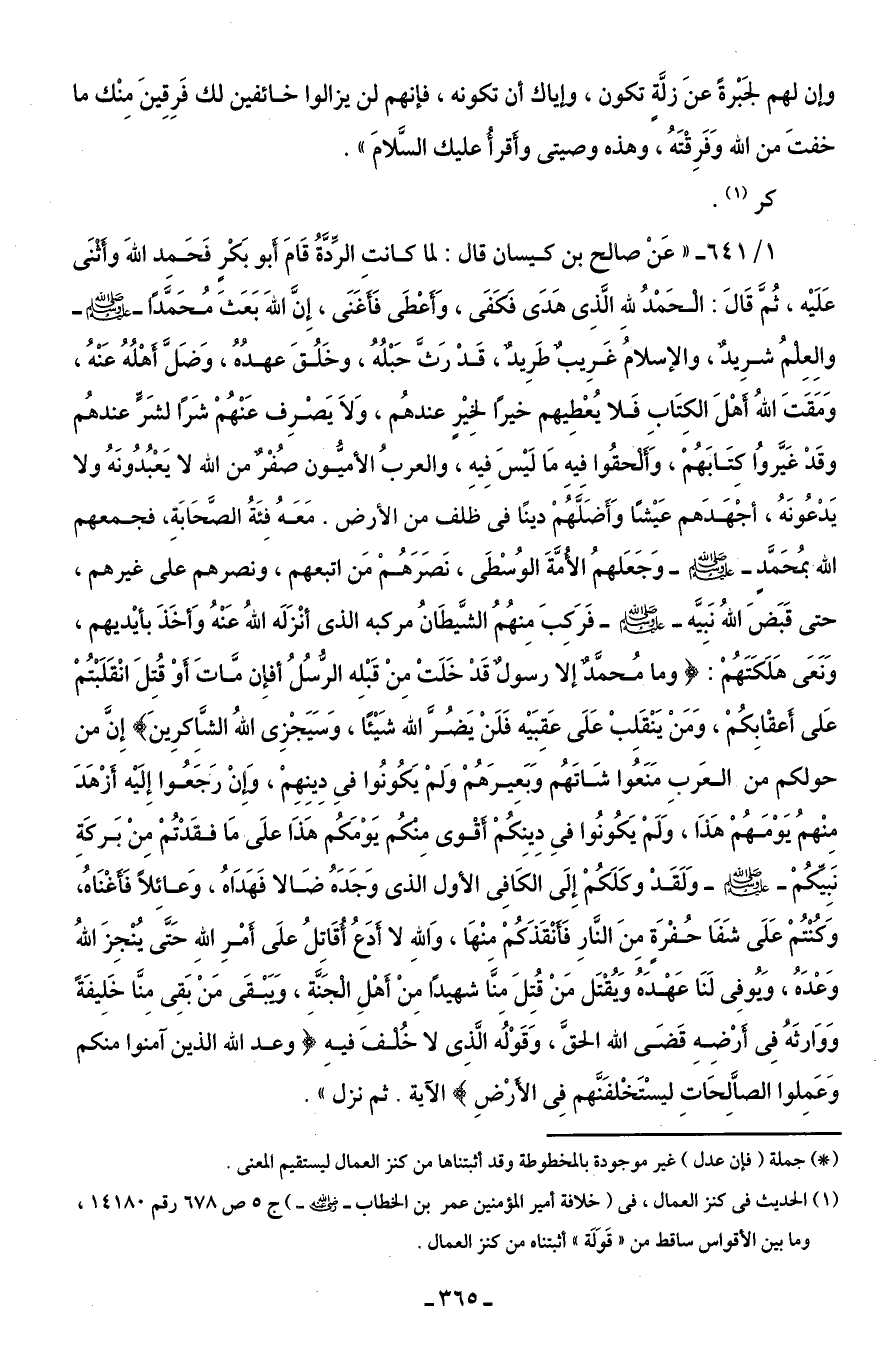 1/ 641 - "عَن صالح بن كيسان قال: لما كانتِ الرِّدَّةُ قَامَ أَبو بَكْرٍ فَحَمِد اللهَ وأَثْنَى عَلَيْه، ثُمَّ قَالَ: الْحَمْد للهِ الَّذِى هَدَى فَكَفَى، وَأَعْطَى فَأَغَنَى، إِنَّ اللهَ بَعَثَ مُحَمَّدًا - صلى الله عليه وسلم - والِعِلْمُ شرِيدٌ، والإسلامُ غَرِيبٌ طَرِيدٌ، قَدْ رَثَّ حَبْلُهُ، وخَلُقَ عهدُهُ، وَضَلَّ أَهْلُهُ عَنْهُ، وَمَقَتَ اللهُ أَهْلَ الكِتَاب فَلا يُعْطِيهم خيرًا لِخيْرٍ عندهُم، وَلَا يَصْرِف عَنْهُمْ شَرًا لشَرٍّ عندهُم وقَدْ غَيَّروُا كِتَابَهُمْ، وَأَلْحقُوا فِيهِ مَا لَيْسَ فِيهِ، والعربُ الأميُّون صُفْرٌ من الله لا يَعْبُدُونَهُ ولا يَدْعُونَهُ، أجْهَدَهم عَيْشًا وَأَضَلَّهُمْ دينًا في ظلف من الأرض. مَعَهُ فِئَةُ الصَّحَابَةِ، فجمعهم الله - بمُحَمَّدٍ - صلى الله عليه وسلم - وَجَعَلهمُ الأُمَّةَ الوُسْطَى، نَصَرَهُمْ مَن اتبعهم، ونصرهم على غيرهم، حتى قَبَضَ اللهُ نَبِيَّه - صلى الله عليه وسلم - فَرَكِبَ مِنهُمُ الشَّيطَانُ مركبه الذى أنْزَلَه اللهُ عَنْهُ وَأخَذَ بأيْديهم، وَنَعَى هَلَكَتَهُمْ: {وَمَا مُحَمَّدٌ إِلَّا رَسُولٌ قَدْ خَلَتْ مِنْ قَبْلِهِ الرُّسُلُ أَفَإِنْ مَاتَ أَوْ قُتِلَ انْقَلَبْتُمْ عَلَى أَعْقَابِكُمْ وَمَنْ يَنْقَلِبْ عَلَى عَقِبَيْهِ فَلَنْ يَضُرَّ اللَّهَ شَيْئًا وَسَيَجْزِي اللَّهُ الشَّاكِرِينَ} إِنَّ من حولكم من العَربِ مَنَعُوا شَاتَهُم وَبَعِيرَهُمْ وَلمْ يَكُونُوا فىِ دِينِهِمْ، وَإِنْ رَجَعُوا إِلَيْه أَزْهَدَ منْهمُ يَوْمَهُمْ هَذَا، وَلَمْ يَكُونُوا فىِ دِينِكُمْ أَقْوى مِنْكُم يَوْمَكُم هَذَا علَى مَا فقَدْتُمْ مِنْ بَركَةِ نَبِيِّكُمْ - صلى الله عليه وسلم - وَلَقَدْ وكَلَكُمْ إِلَى الكَافِى الأول الذى وَجَدَهُ ضَالا فَهَدَاهُ، وَعائِلًا فَأَغْنَاهُ، وَكُنْتُمْ عَلَى شَفَا حُفْرَةٍ مِنَ النَّارِ فَأَنْقَذَكُمْ منْهَا، وَاللهِ لا أَدَعُ أُقَاتِلُ علَى أَمْرِ اللهِ حَتَّى يُنْجِزَ اللهُ وَعْدَهُ، وَيُوفِى لَنَا عَهْدَهُ وَيُقْتَل مَنْ قُتِلَ مِنَّا شهيدًا مِنْ أَهْلِ الْجَنَّة، وَيَبْقَى مَنْ بَقِى مِنَّا خَلِيفَةً وَوَارثَهُ فِى أَرْضِهِ قَضَى الله الحقَّ، وَقَوْلُه الَّذِى لا خُلفَ فيهِ {وَعَدَ اللَّهُ الَّذِينَ آمَنُوا مِنْكُمْ وَعَمِلُوا الصَّالِحَاتِ لَيَسْتَخْلِفَنَّهُمْ فِي الْأَرْضِ} الآية. ثم نزل".