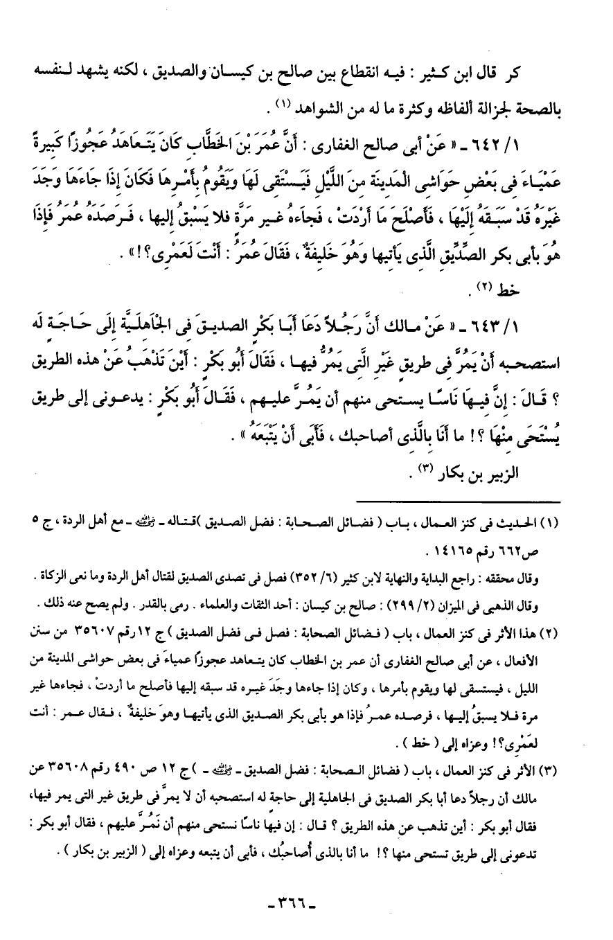 (¬2) هذا الأثر في كنز العمال، باب (فضائل الصحابة: فصل في فضل الصديق) ج 12 رقم 35607 من سنن الأفعال، عن أبى صالح الغفارى أن عمر بن الخطاب كان يتعاهد عجوزًا عمياءَ في بعض حواشى المدينة من الليل، فيستسقى لها ويقوم بأمرها، وكان إذا جاءها وجَدَ غيره قد سبقه إليها فأصلح ما أردت، فجاءها غير مرة فلا يسبقُ إليها، فرصده عمرُ فإذا هو بأبى بكر الصديق الذى يأتيها وهوَ خليفةٌ، فقال عمر: أنت لعَمْرِى؟ ! وعزاه إلى (خط).