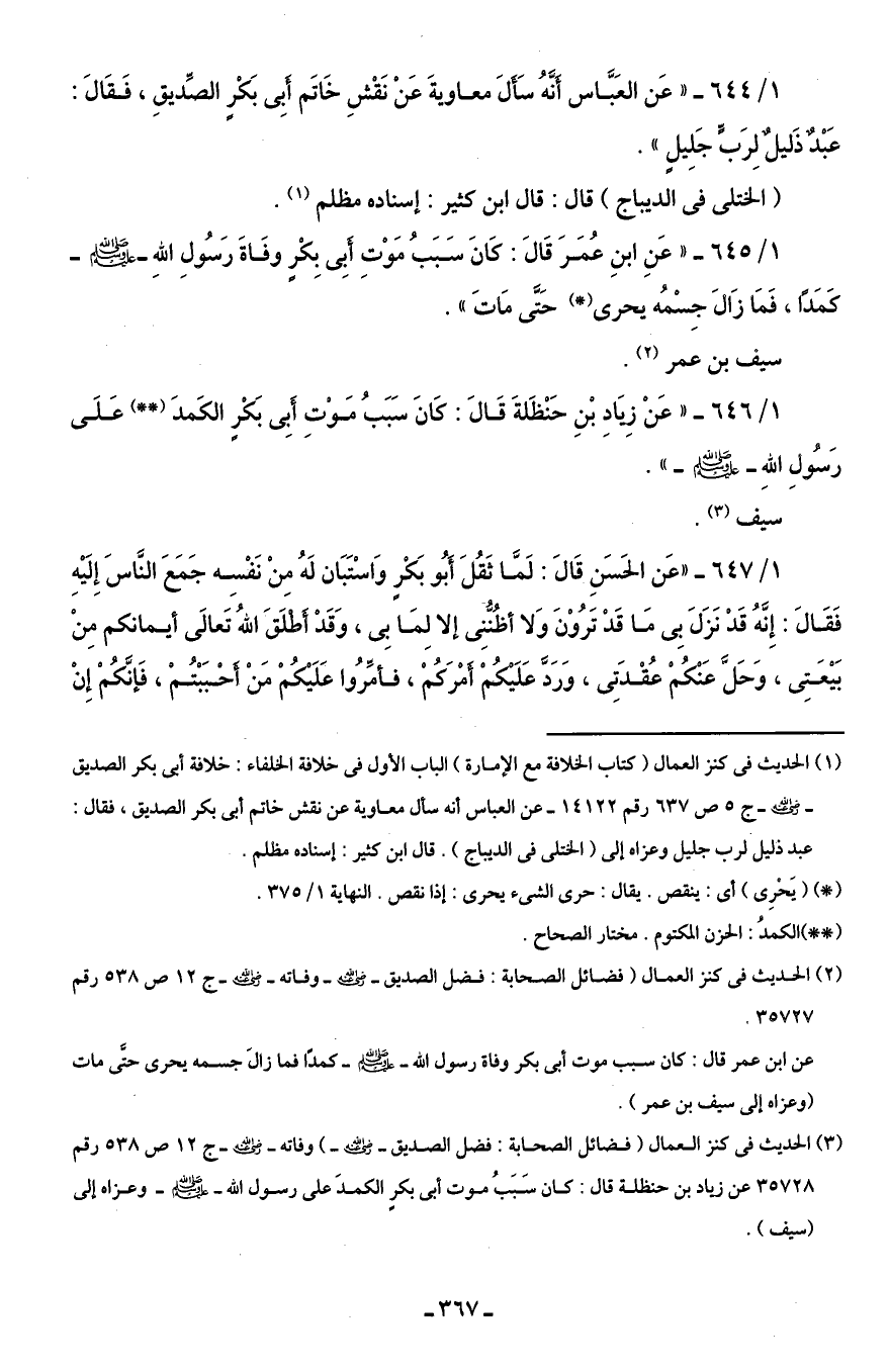 1/ 646 - "عَنْ زِيَادِ بْنِ حَنْظَلةَ قَالَ: كَانَ سَبَبُ مَوْتِ أَبِى بَكْرٍ الكَمدَ (* *) عَلَى رَسُول اللهِ - صلى الله عليه وسلم -".