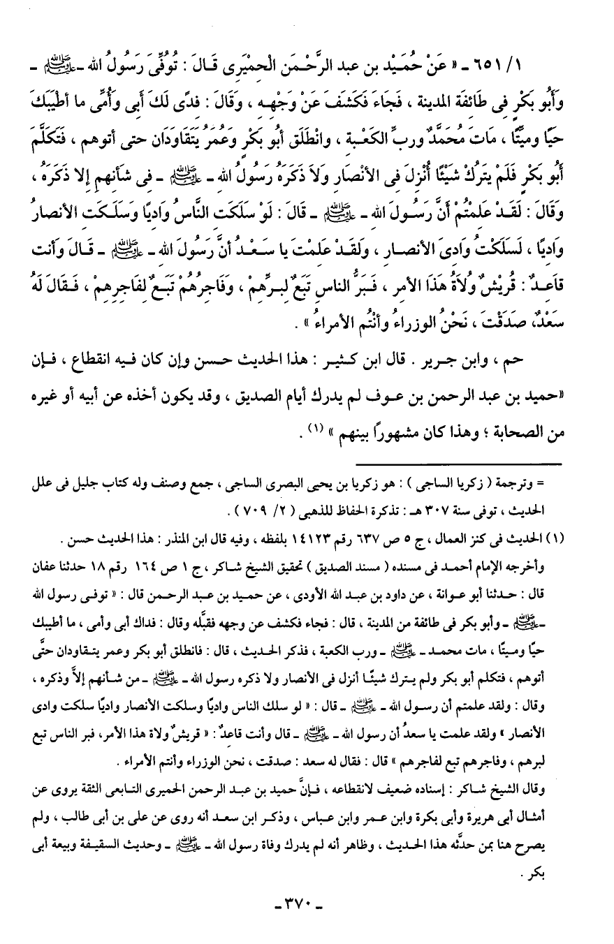 وقال الشيخ شاكر: إسناده ضعيف لانقطاعه، فإنَّ حميد بن عبد الرحمن الحميرى التابعى الثقة يروى عن أمثال أبى هريرة وأبى بكرة وابن عمر وابن عباس، وذكر ابن سعد أنه روى عن على بن أبى طالب، ولم يصرح هنا بمن حدَّثه هذا الحديث، وظاهر أنه لم يدرك وفاة رسول الله - صلى الله عليه وسلم - وحديث السقيفة وبيعة أبى بكر.