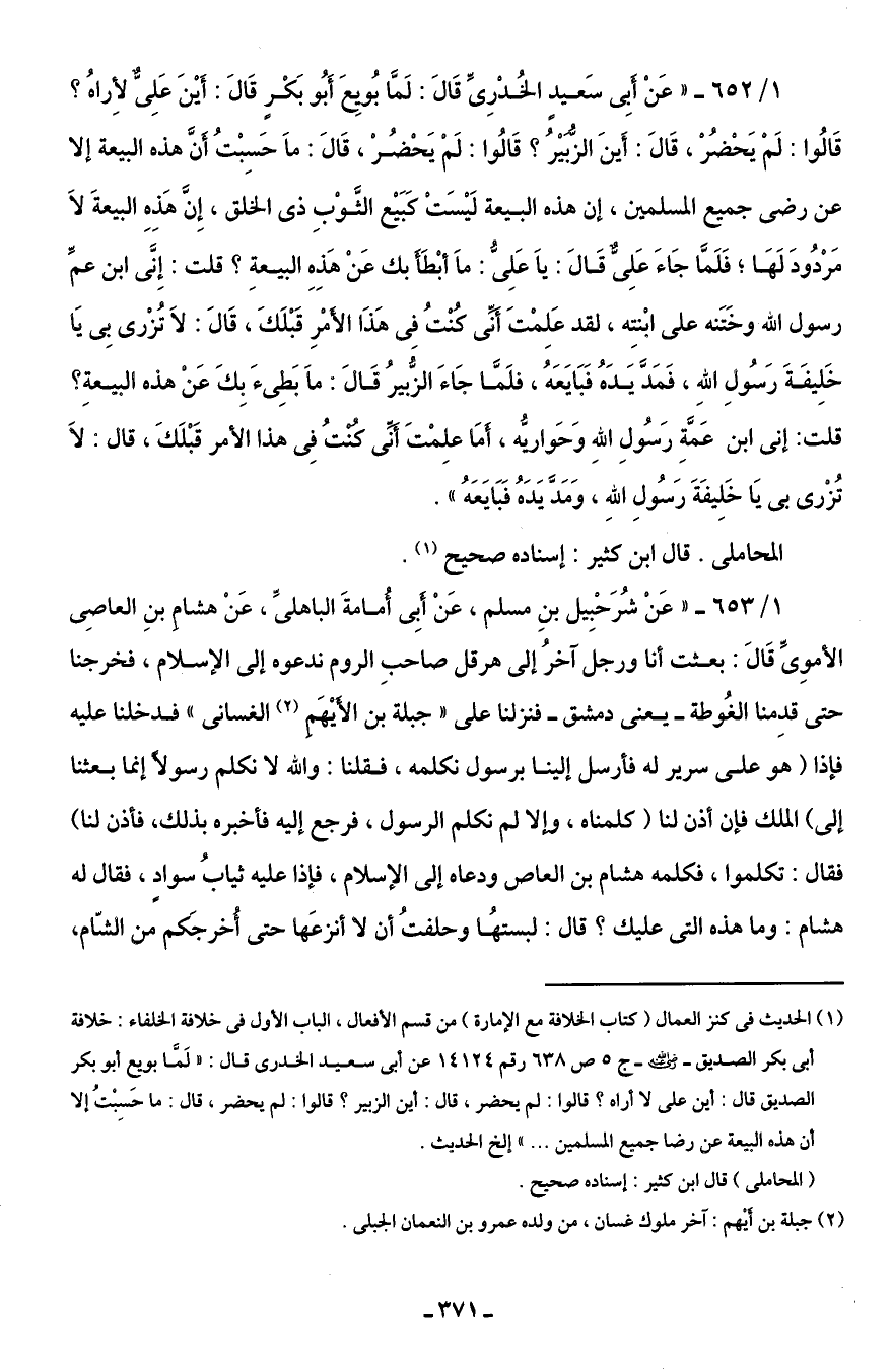 1/ 652 - "عَنْ أَبِى سَعيدٍ الخُدْرِىِّ قَالَ: لَمَّا بُوِيعَ أَبُو بَكْرٍ قَالَ: أَيْنَ عَلِىٌّ لِأراهُ؟ قَالُوا: لَمْ يَحْضُرْ، قَالَ: أَينَ الزُّبَيْرُ؟ قَالُوا: لَمْ يَحْضُرْ، قَالَ: مَا حَسِبْتُ أَنَّ هذه البيعة إلا عن رضى جميع المسلمين، إن هذه البيعة لَيْسَتْ كَبَيعْ الثَّوْبِ ذى الخلق، إِنَّ هَذِهِ البيعةَ لَا مَرْدُودَ لَهَا؛ فَلَمَّا جَاءَ عَلِىٌّ قَالَ: ياَ عَلِىُّ: ماَ أَبْطَأَ بك عَنْ هَذِهِ البيعةِ؟ قلت: إِنِّى ابن عمِّ رسول الله وخَتَنه على ابْنتِه، لقد عَلِمْتَ أَنِّى كُنْتُ فِى هَذَا الأَمْرِ قَبْلَكَ، قَالَ: لَا تُزْرى بِى يَا خَلِيفَةَ رَسُولِ اللهِ، فَمَدَّ يَدَهُ فَبَايَعَهُ، فلَمَّا جَاءَ الزُّبيرُ قَالَ: مَا بَطِئَ بِكَ عَنْ هذه البيعةِ؟ قلت: إنى ابن عَمَّةِ رَسُولِ اللهِ وَحَواريُّه، أَمَا علِمْتَ أَنِّى كُنْتُ فِى هذا الأمر قَبْلَكَ، قال: لَا تُزْرى بى يَا خَلِيفَةَ رَسُولِ اللهِ، وَمَدَّ يَدَهُ فَبَايَعَهُ".