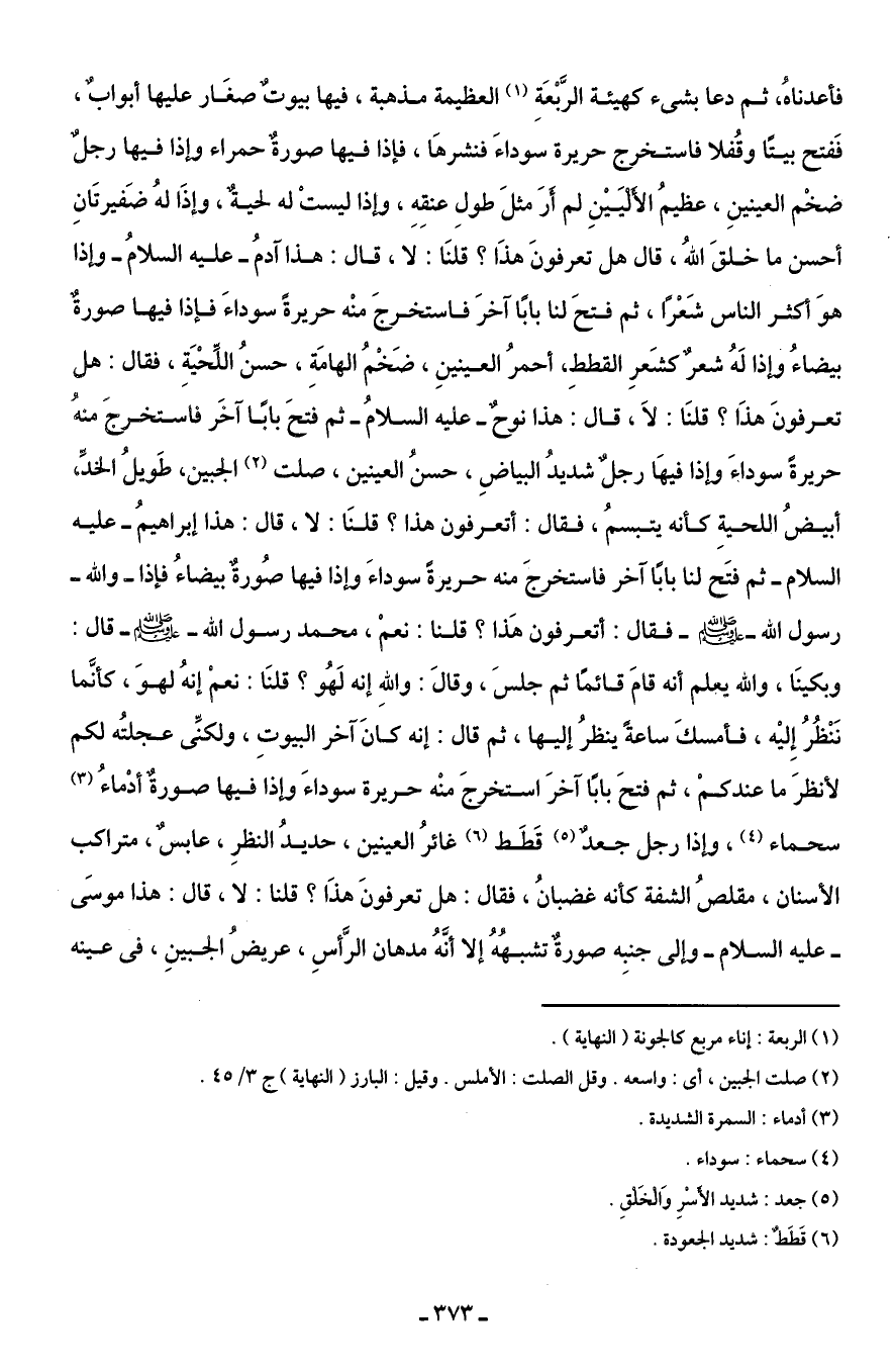 فأعدناهُ، ثم دعا بشئ كهيئة الرَّبْعَةِ (¬1) العظيمة مذهبة، فيها بيوتٌ صغَار عليها أبوابٌ، فَفتح بيتًا وقُفلا فاستخرج حريرة سوداءَ فنشرهَا، فإذا فيها صورةٌ حمراء وإذا فيها رجلٌ ضخْم العينينِ، عظيمُ الأَلْيَيْنِ لم أَرَ مثلَ طولِ عنقِهِ، وإذا ليستْ له لحيةٌ، وإذَا لهُ ضَفيرتَانِ أحسن ما خلقَ اللهُ، قال هل تعرفونَ هذَا؟ قلنَا: لا، قال: هذا آدمُ - عليه السلامُ - وإذا هوَ أكثر الناس شَعْرًا، ثم فتحَ لنا بابًا آخرَ فاستخرجَ منْه حريرةً سوداءَ فإذا فيها صورةٌ بيضاءُ وإذا لَهُ شعرٌ كشَعرِ القططِ، أحمرُ العينينِ، ضَخْمُ الهامَةِ، حسنُ اللِّحْيَةِ، فقال: هل تعرفونَ هذَا؟ قلنَا: لَا، قال: هذا نوحٌ - عليه السلامُ - ثم فتحَ بابًا آخَر فاستخرجَ منهُ حريرةً سوداءَ وإذا فيهَا رجلٌ شديدُ البياضِ، حسنُ العينين، صلت (¬2) الجبين، طَويلُ الخدِّ، أبيضُ اللحيةِ كأنه يتبسمُ، فقال: أتعرفون هذا؟ قلنَا: لا، قال: هذا إبراهيمُ - عليه السلام - ثم فتَح لنا بابًا آخر فاستخرجَ منه حريرةً سوداءَ وإذا فيها صُورةٌ بيضاءُ فإذا - والله - رسول الله - صلى الله عليه وسلم - فقال: أتعرفون هَذا؟ قلنا: نعمْ، محمد رسول الله - صلى الله عليه وسلم - قال: وبكينَا، والله يعلم أنه قامَ قائمًا ثم جلسَ، وقالَ: واللهِ إنه لَهُو؟ قلنَا: نعمْ إنهُ لهوَ، كأنَّما نَنْظُرُ إِليْه، فأمسكَ ساعةً ينظرُ إليها، ثم قال: إنه كانَ آخر البيوتِ، ولكنِّى عجلتُه لكم لأنظرَ ما عندكمْ، ثم فتحَ بابًا آخرَ استخرجَ منْه حريرة سوداءَ وإذا فيها صورةٌ أدْماءُ (¬3) سحماء (¬4)، وإذا رجل جعدٌ (¬5) قَطَط (¬6) غائرُ العينين، حديدُ النظرِ، عابسٌ، متراكب الأسنان، مقلصُ الشفة كأنه غضبانُ، فقال: هل تعرفونَ هذَا؟ قلنا: لا، قال: هذا موسَى - عليه السلام - وإلى جنبِه صورةٌ تشبهُهُ إلا أنَّهُ مدهان الرَّأسِ، عريضُ الجبينِ، في عينه