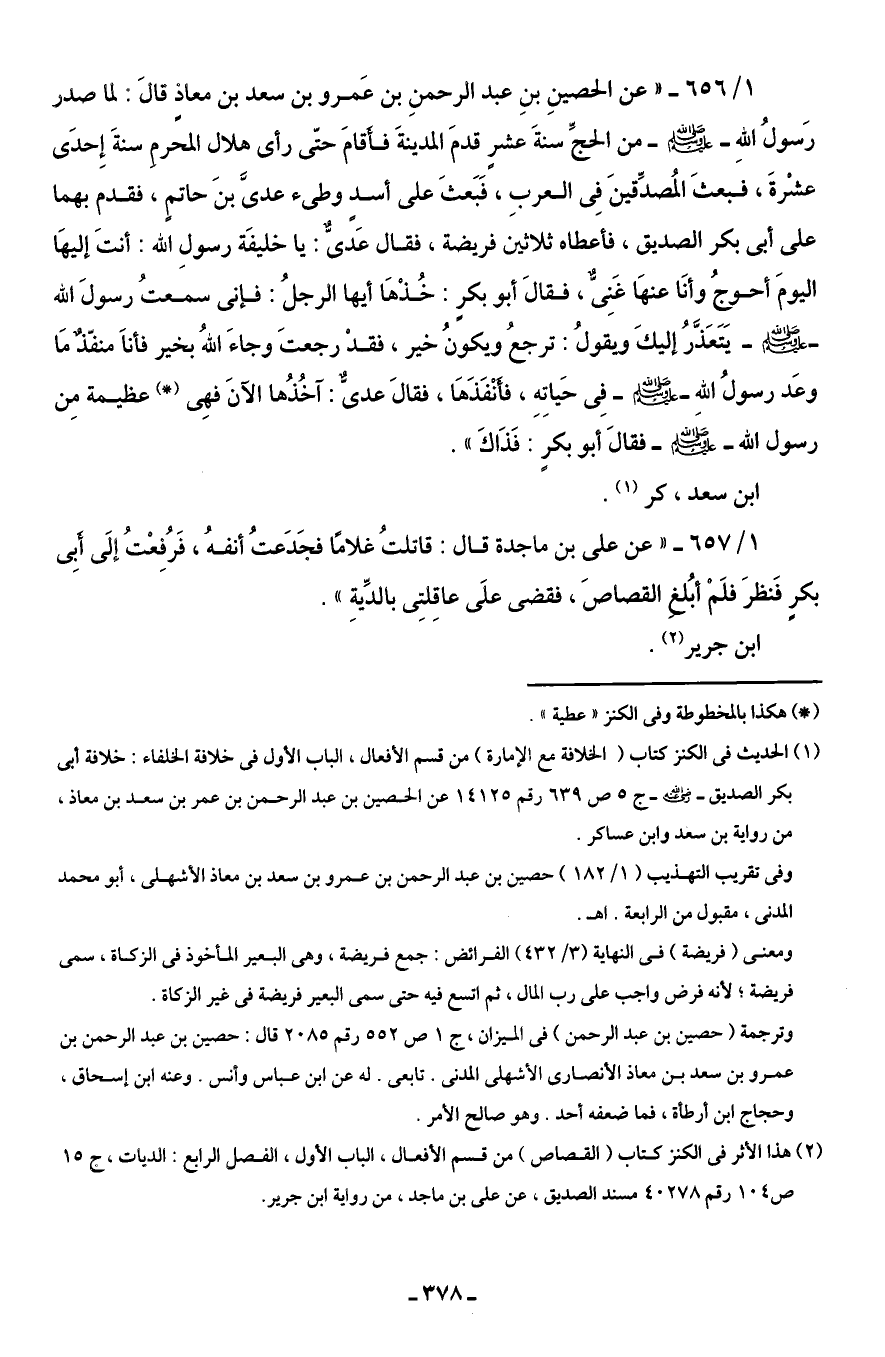 1/ 656 - "عن الحصينِ بنِ عبد الرحمنِ بن عَمرو بن سعد بن معاذٍ قال: لما صدر رَسولُ اللهِ - صلى الله عليه وسلم - من الحجِّ سنةَ عشرٍ قدمَ المدينةَ فأَقامَ حتّى رأى هلال المحرمِ سنةَ إِحدَى عشْرةَ، فبعثَ المُصدِّقينَ فِى العربِ، فَبَعثَ على أسدٍ وطئ عدىَّ بنَ حاتمٍ، فقدم بهما على أبى بكر الصديق، فأعطاه ثلاثين فريضة، فقال عَدىٌّ: يا خليفَة رسولِ الله: أنتَ إليهَا اليومَ أحوجُ وأنَا عنهَا غَنِىٌّ، فقالَ أبو بكرٍ: خُذْهَا أيها الرجلُ: فإنى سمعتُ رسولَ الله - صلى الله عليه وسلم - يَتَعَذَّرُ إليكَ ويقولُ: ترجعُ ويكونُ خير، فقدْ رجعتَ وجاءَ اللهُ بخير فأنَا منفّذٌ مَا وعَد رسولُ الله - صلى الله عليه وسلم - فِى حَياتِهِ، فأَنْفَذَهَا، فقالَ عدىٌّ: آخُذُها الآنَ فهِى (*) عظيمة مِن رسول الله - صلى الله عليه وسلم - فقالَ أبو بكرٍ: فَذَاكَ".