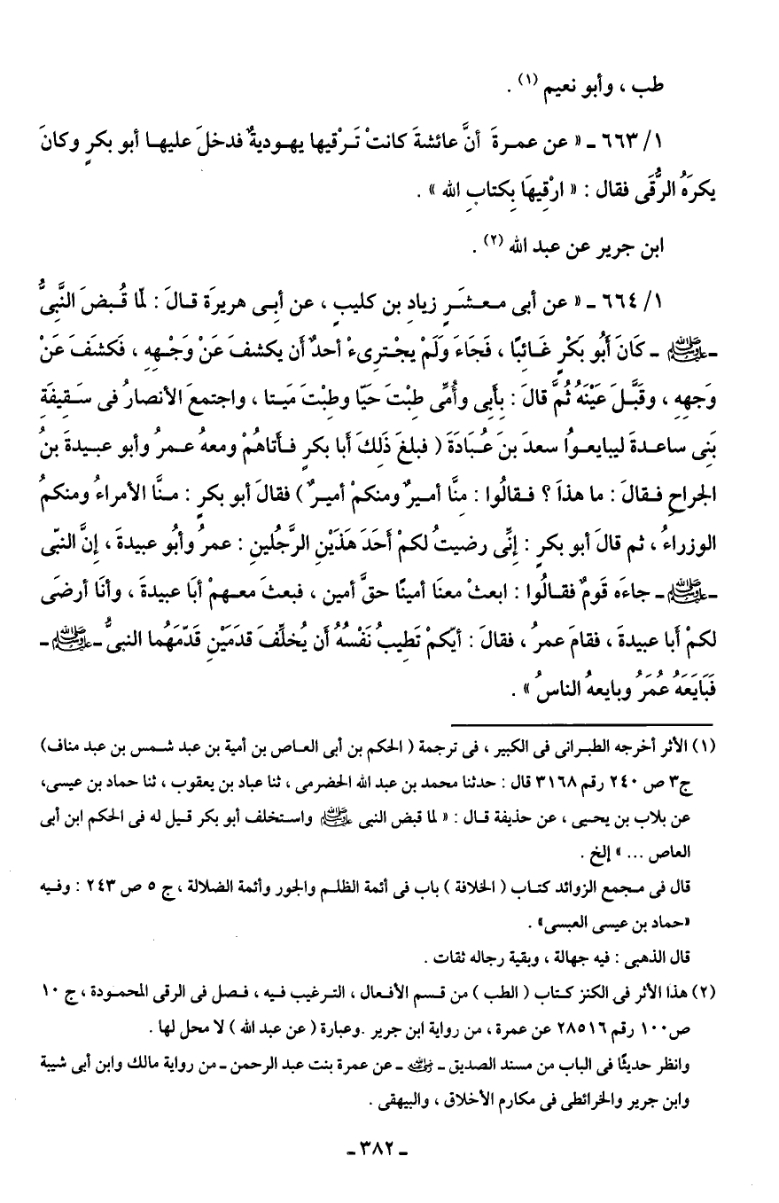 1/ 663 - "عن عمرةَ أنَّ عائشةَ كانتْ تَرْقيها يهوديةٌ فدخلَ عليها أبو بكرٍ وكانَ يكرَهُ الرُّقَى فقال: "ارْقِيهَا بِكتابِ الله".