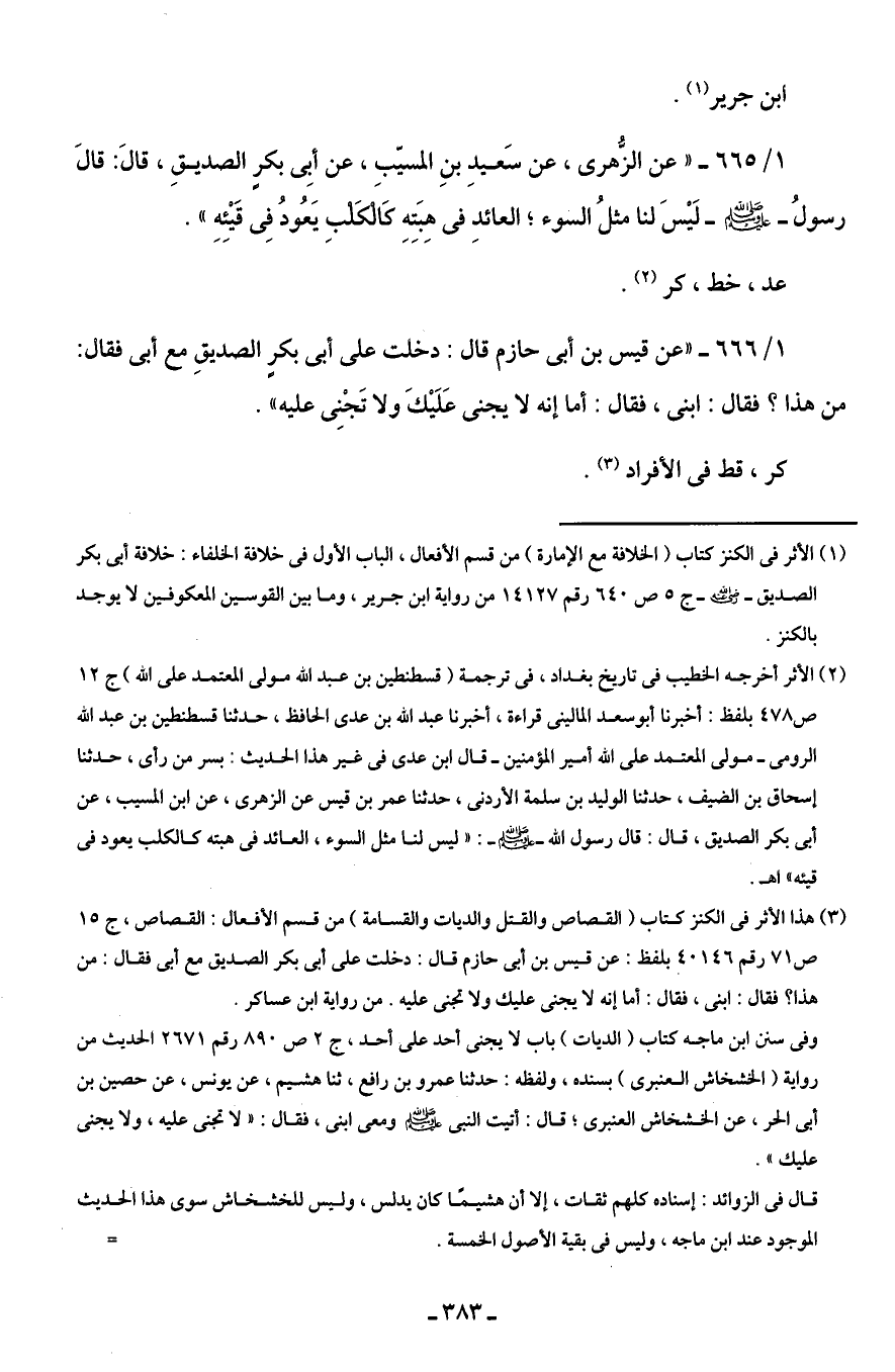(¬3) هذا الأثر في الكنز كتاب (القصاص والقتل والديات والقسامة) من قسم الأفعال: القصاص، ج 15 ص 71 رقم 40146 بلفظ: عن قيس بن أبى حازم قال: دخلت على أبى بكر الصديق مع أبى فقال: من هذا؟ فقال: ابنى، فقال: أما إنه لا يجنى عليك ولا تجنى عليه. من رواية ابن عساكر.