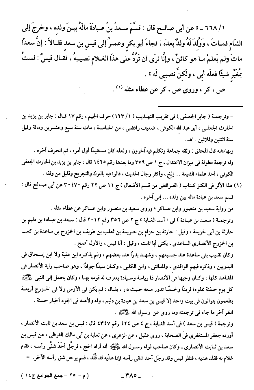 1/ 668 - "عن أبى صالح قال: قسَّمَ سعدُ بنُ عبادَةَ مالَهُ بينَ ولدِه، وخرجَ إلى الشّامِ فماتَ، وَوُلِدَ لَهُ ولدٌ بعدَه، فجاءَ أبو بكرٍ وعمرُ إلى قيسِ بن سعدٍ فقالَا: إنَّ سعدًا ماتَ وْلم يَعلمْ ما هو كائنٌ، وإنَّا نرَى أن تَرُدَّ على هذَا الغلامِ نصيبهُ، فقال قيسٌ: لستُ بمُغَيِّرٍ شيئًا فعلَه أبِى، ولَكِنَّ نصيبِى لَه".