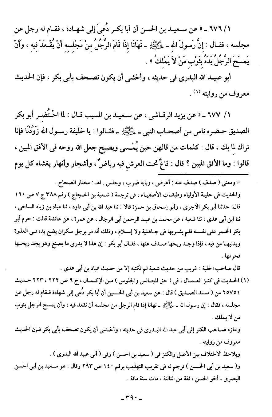 1/ 676 - "عن سعيد بن الحسن أن أبا بكر دُعِىَ إلى شهادة، فقام له رجل عن مجلسه، فقال: إِنَّ رَسولَ اللهِ - صلى الله عليه وسلم - نَهَانَا إِذَا قَامَ الرَّجُلُ مِنْ مَجْلِسِهِ أَنْ يُقْعَدَ فِيهِ، وَأَنْ يَمسَحَ الرَّجُلُ يَدَهُ بِثَوْبِ مَنْ لَا يَمْلِكُ".