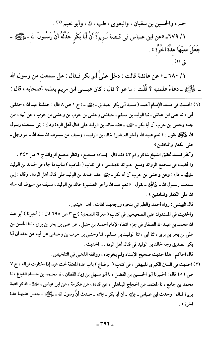 (¬2) الحديث في السنن الكبرى للبيهقى، في كتاب (الرضاع) باب عدة المعتقة تحت عبد إذا اختارت فراقه، ج 7 ص 451 قال: أخبرنا أبو الحسين بن الفضل، نا أبو سهل بن زياد القطان، نا محمد بن حماد الدباغ، نا محمد بن جامع، نا المعتمد عن الحجاج الباهلى، عن قتادة، عن عكرمة، عن ابن عباس - رضي الله عنهما - فذكر قصة بريرة قال: وحدث ابن عباس - رضي الله عنهما - أن أبا بكر - رضي الله عنه - حدث أَنَّ رسول الله - صلى الله عليه وسلم - جعل عليها عدة الحرة".