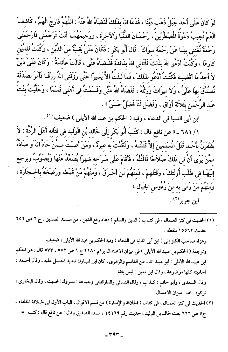 (¬2) الحديث في كنز العمال، في كتاب (الخلافة والإمارة) من قسم الأقوال، الباب الأول في خلافة الخلفاء، ج 5 ص 666 بعث خالد بن الوليد، حديث رقم 14169، مسند الصديق وقال: عن نافع قال: كتب =