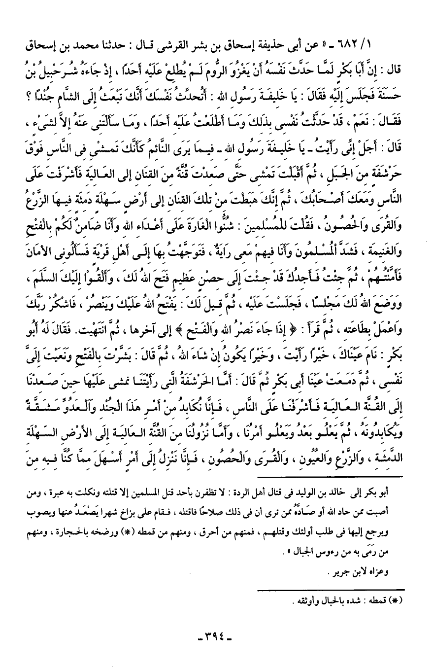 1/ 682 - "عن أبى حذيفة إسحاق بن بشر القرشى قال: حدثنا محمد بن إسحاق قال: إِنَّ أبَا بَكْر لَمَّا حَدَّثَ نَفْسَهُ أَنْ يَغْزُوَ الرُّومَ لَمْ يُطْلِعْ عَلَيْهِ أحَدًا، إِذْ جَاءَهُ شُرَحْبِيلُ بْنُ حَسَنَةَ فَجَلَسَ إِلَيْهِ فَقَالَ: يَا خَلِيفَةَ رَسُولِ الله: أَتُحدِّثُ نَفْسَكَ أَنَّكَ تَبْعَثُ إِلَى الشَّام جُنْدًا؟ فَقَالَ: نَعَمْ، قَدْ حَدَّثْتُ نَفْسِى بِذَلِكَ وَمَا أَطْلَعْتُ عَلَيْهِ أَحَدًا، وَمَا سَأَلْتَنِى عَنْهُ إِلَّا لِشَىْءٍ، قَالَ: أَجَلْ إِنِّى رَأَيْتُ - يَا خَليفَةَ رَسُول اللهِ - فِيمَا يَرَى النَّائِمُ كَأَنَّكَ تَمشْىِ فِى النَّاسِ فَوْقَ حَرْشَفَةٍ مِنَ الجَبَلِ، ثُمَ أَقْبَلْتَ تَمْشِى حَتَّى صَعِدْتَ قُنَّةً مِنَ القِنَانِ إلى العَالِيَةِ فَأَشْرَفْتَ عَلَى النَّاسِ وَمَعَكَ أَصْحَابُكَ، ثُمَّ إِنَّكَ هَبَطْتَ مِنْ تِلْكَ القِنَانِ إلى أَرْضٍ سَهْلَةٍ دَمِثَةٍ فِيهَا الزَّرْعُ وَالقُرَى وَالحُصُونُ، فَقُلتَ للمُسْلِمِينَ: شُنُّوا الْغَارَةَ عَلَى أَعْدَاءِ اللهِ وَأَنَا ضَامِنٌ لَكُمْ بِالْفتْحِ وَالغَنِيمَةِ، فَشَدَّ اْلمُسْلِمُونَ وَأَنَا فِيهمْ مَعِى رَايَةٌ، فَتَوَجَّهْتُ بِهَا إِلَى أَهلِ قَرْيَةٍ فَسأَلُونِى الأمَانَ فَأَمَّنْتُهُمْ، ثُمَّ جِئْتُ فَأَجِدُكَ قَدْ جِئْتَ إِلَى حِصْنٍ عَظِيمٍ فَتَحَ اللهُ لَكَ، وَأَلْقُوْا إِلَيْكَ السَّلَمَ، وَوَضَعَ اللهُ لَكَ مَجْلِسًا، فَجَلَسْتَ عَلَيْه، ثُمَّ قِيلَ لَكَ: يَفْتَحُ اللهُ عَلَيْكَ وَيَنْصُرْ، فَاشْكُرْ رَبَّكَ وَاعْمَلْ بِطَاعَتهِ، ثُمَّ قَرَأَ: {إِذَا جَاءَ نَصْرُ اللَّهِ وَالْفَتْحُ} إلى آخرها، ثُمَّ انَتَهْيت. فَقَالَ لَهُ أَبُو بَكْرٍ: نَامَ عَيْنَاكَ، خَيْرًا رَأَيْتَ، وَخَيْرًا يَكُونُ إِنْ شَاءَ اللهُ، ثُمَّ قَالَ: بَشَّرْتَ بِالْفَتْحِ وَنَعَيْتَ إِلَىَّ نَفْسِى، ثُمَّ دَمَعَتْ عَيْنَا أَبِى بَكْرٍ ثُمَّ قَالَ: أَمَّا الحَرْشَفَةُ الَّتِى رَأَيْتَنَا نمشى عَلَيْهَا حِينَ صَعِدْنَا إِلَى القُنَّةِ العَالِيَةِ فَأَشْرَفْنَا عَلَى النَّاسِ، فَإِنَّا نُكَابِدُ مِنْ أَمْرِ هَذَا الْجُنْدِ وَاَلْعَدُوِّ مَشَقَّةً وَيُكَابِدُونَهُ، ثُمَّ يَعْلُو بَعْدُ وَيَعْلُو أَمْرُنَا، وَأَمَّا نُزُولُنَا مِنَ القُنَّةِ العَالِيَة إِلَى الأَرْضِ السّهْلَةِ الدَّمِثَةِ، وَالزَّرْعِ وَالعُيُونِ، وَالْقُرَى وَالْحُصُونِ، فَإِنَّا نَنْزِلُ إِلَى أَمْرٍ أَسْهَلَ مِمَّا كُنَّا فِيهِ مِنَ