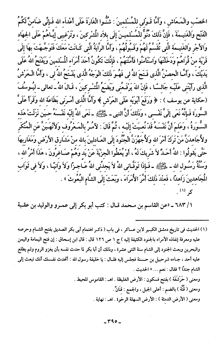 1/ 683 - "عن القاسم بن محمد قال: كتب أبو بكر إلى عمرو والوليد بن عقبة