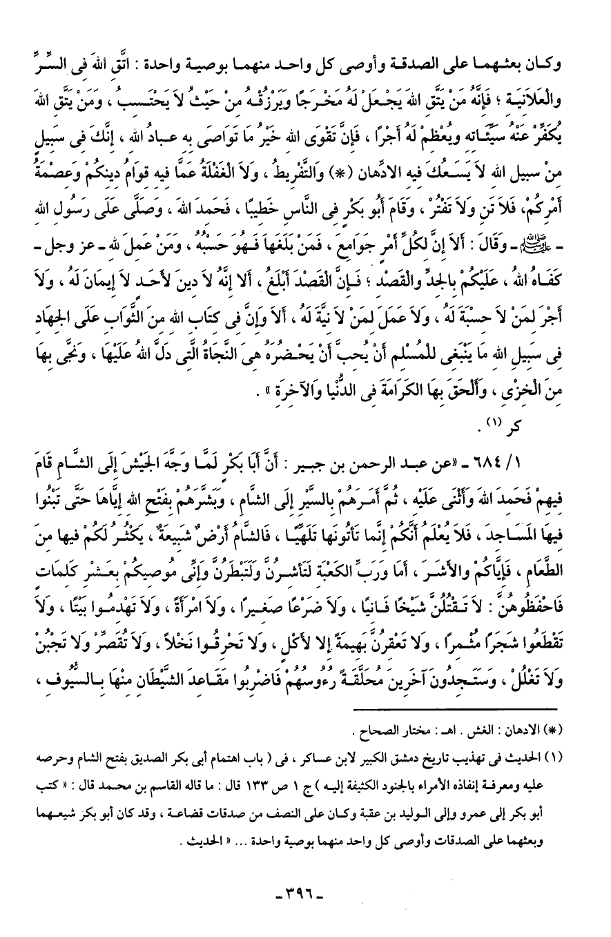 1/ 684 - "عن عبد الرحمن بن جبير: أَنَّ أَبَا بَكْرٍ لَمَّا وَجَّهَ الجَيْشَ إِلَى الشَّامِ قَامَ فِيهِمْ فَحَمِدَ اللهَ وَأَثْنَى عَلَيْهِ، ثُمَّ أَمَرَهُمْ بِالسَّيْرِ إِلَى الشَّامِ، وَبَشَّرَهُمْ بِفَتْحِ اللهِ إِيَّاهَا حَتَّى تَبْنُوا فِيهَا المَسَاجِدَ، فَلَا يُعْلَمُ أَنَّكُمْ إِنَّما تَأتُونَها تَلَهِّيًا، فَالشَّامُ أَرْضٌ شَبِيعَةٌ، يَكْثُرُ لَكُمْ فيها مِنَ الطَّعَامِ، فَإِيَّاكُمْ والأَشَرَ، أَمَا وَرَبِّ الكَعْبَةِ لَتَأشِرُنَّ وَلَتَبْطَرُنَّ وَإِنِّى مُوصِيكُمْ بِعَشْرِ كَلِمَاتٍ فَاحْفَظُوهُنَّ: لَا تَقْتُلُنَّ شَيْخًا فَانيًا، وَلَا ضَرْعًا صَغِيرًا، وَلَا امْرَأَةً، وَلَا تَهْدِمُوا بَيْتًا، وَلَا تَقْطَعُوا شَجَرًا مُثْمِرًا، وَلا تَعْقِرُنَّ بَهِيمَةً إِلا لأَكْلٍ، وَلا تَحْرِقُوا نَخْلًا، وَلَا تُقَصَّرْ وَلا تَجْبُنْ وَلَا تَغْلُلْ، وَسَتَجِدُونَ آخَرِينَ مُحَلَّقَةً رُءُوسُهُمْ فَاضْرِبُوا مَقَاعِدَ الشَّيْطَانِ مِنْهَا بِالسُّيُوفِ،
