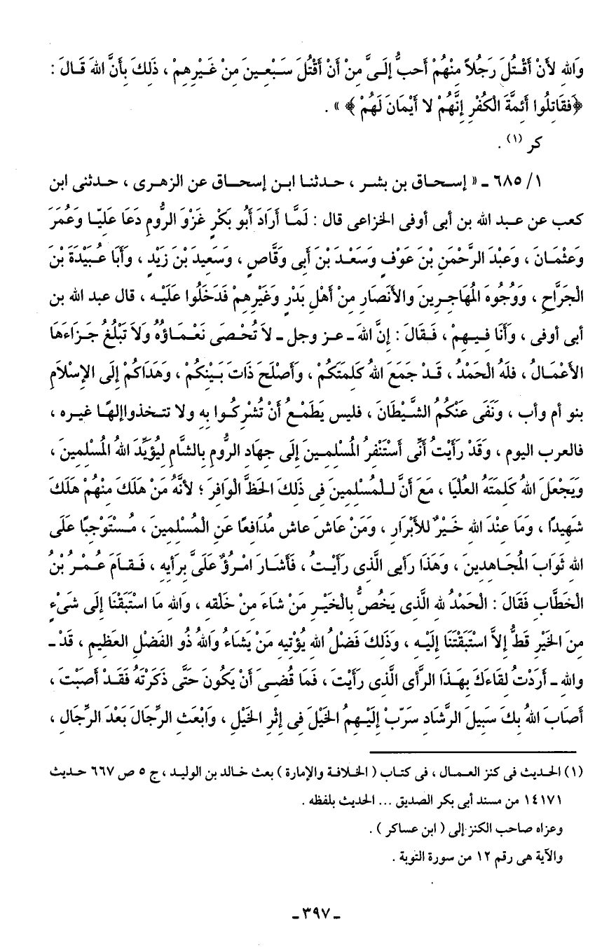 1/ 685 - "إسحاق بن بشر، حدثنا ابن إسحاق عن الزهرى، حدثنى ابن كعب عن عبد الله بن أبى أوفى الخزاعى قال: لَمَّا أرَادَ أَبُو بَكْرٍ غَزْوَ الرُّومِ دَعَا عَلِيّا وَعُمَرَ وَعثْمَانَ، وَعبْدَ الرَّحْمَنِ بْنَ عَوْفٍ وَسَعْدَ بْنَ أَبِى وَقَّاصٍ، وَسَعِيدَ بْنَ زَيْدٍ، وَأَبَا عُبَيْدَةَ بْنَ الْجَرَّاحِ، وَوُجُوهَ المُهَاجِرِينَ والأَنصَارِ مِنْ أَهْلِ بَدْرٍ وَغَيْرِهِمْ فَدَخَلُوا عَلَيْه، قال عبد الله بن أبى أوفى، وَأنَا فِيهِمْ، فَقَالَ: إِنَّ اللهَ - عز وجل - لَا تُحْصَى نَعْمَاؤُهُ وَلاَ تَبْلُغُ جَزَاءَهَا الأَعْمَالُ، فلَهُ الْحَمْدُ، قَدْ جَمَعَ اللهُ كَلِمَتَكُمْ، وَأَصْلَحَ ذَاتَ بَيْنِكُمْ، وَهَدَاكُمْ إِلَى الإِسْلَامِ بنو أم وأب، وَنَفَى عَنْكُمُ الشَّيْطَانَ، فليس يَطَمْعُ أنْ تُشْرِكُوا بِهِ ولا تتخذوا إلهًا غيره، فالعرب اليوم، وَقَدْ رَأَيْتُ أَنَّى أَسْتَنْفِرُ المُسْلِمِينَ إِلَى جِهَاد الرُّوم بِالشَّام لِيُؤَيَّدَ اللهُ المُسْلِمِينَ، وَيَجْعَل اللهُ كَلِمَتَهُ العُلْيَا، مَعَ أنَّ للْمُسْلِمِينَ فِى ذَلِكَ الحَظَّ الْوَافِرَ؛ لأنَّهُ مَنْ هَلَكَ مِنْهُمْ هَلكَ شَهِيدًا، وَمَا عِنْدَ اللهِ خَيْرٌ للأَبْرَارِ، وَمَنْ عَاشَ عاش مُدَافِعًا عَنِ المُسْلِمِينَ، مُسْتَوْجِبًا عَلَى اللهِ ثَوَابَ المُجَاهِدِينَ، وَهَذَا رَأيى الَّذِى رَأَيْتُ، فَأَشَارَ امْرُؤٌ عَلَىَّ بِرَأيِهِ، فَقَامَ عُمْرُ بْنُ الْخَطَّابِ فَقَالَ: الحَمْدُ للهِ الَّذِى يَخُصُّ بِالْخَيْرِ مَنْ شَاءَ مِنْ خَلْقهِ، وَاللهِ مَا اسْتَبَقْنَا إِلَى شَىْءٍ مِنَ الخَيْرِ قَطُّ إِلَّا اسْتَبَقْتَنَا إِلَيْهِ، وَذَلِكَ فَضْلُ اللهِ يُؤْتِيهِ مَنْ يَشَاءُ وَاللهُ ذُو الفَضْلِ العَظِيم، قَدْ - واللهِ - أرَدْتُ لِقَاءَكَ بِهَذَا الرَّأى الَّذِى رَأَيْتَ، فَمَا قُضِىَ أنْ يَكُونَ حَتَى ذَكَرْتَهُ فَقَدْ أَصَبْتَ، أَصَابَ اللهُ بِكَ سَبِيلَ الرَّشَادِ سَرّبْ إِلَيْهِمُ الخَيْلَ فِى إِثْرِ الخَيْلِ، وَابْعَثِ الرَّجَالَ بَعْدَ الرِّجَالِ،