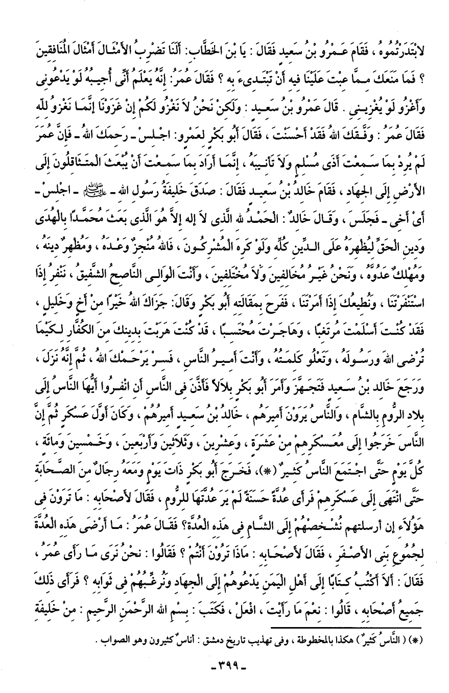 لابْتَدَرْتُمُوهُ، فَقَامَ عَمْرُو بْنُ سَعِيدٍ فَقَالَ: يَا بْنَ الخَطَّابِ: ألَنَا تَضْرِبُ الأَمْثَالَ أمْثَالَ المُنَافقِينَ؟ فَمَا مَنَعَكَ مِمَّا عِبْتَ عَلَيْنَا فِيهِ أَنْ تَبْتَدِئَ بِهِ؟ فَقَالَ عُمَرُ: إِنَّهُ يَعْلمُ أنِّى أُجِيبُهُ لَوْ يَدْعُونِى وَأَغْزُو لَوْ يُغزِينِىِ. قَال عَمْرُو بن سَعِيدٍ: وَلَكِن نَحْن لَا نَغْزُو لَكُمْ إِنَّ غَزَوْنَا إنَّمَا نغْزوُ لِلّهِ فَقَالَ عُمَرُ: وَفَّقَكَ اللهُ فَقَدْ أَحْسَنْتَ، فَقَالَ أَبُو بَكْرٍ لِعَمْرٍو: اجْلِسْ - رَحِمَك اللهُ - فَإِنَّ عُمَرَ لَمْ يُرِدْ بِمَا سَمِعْتَ أَذَى مُسْلِمٍ وَلَا تَأنِيبَهُ، إِنَّمَا أَرَادَ بِمَا سَمِعْتَ أَنْ يُبْعَثَ المتَثَاقِلُونَ إِلَى الأَرْضِ إِلَى الجِهَادِ، فَقَامَ خَالِدُ بْنُ سَعِيدٍ فَقَالَ: صَدَقَ خَلِيفَةُ رَسُولِ اللهِ - صلى الله عليه وسلم - اجْلِسْ - أَىْ أَخِى - فَجَلَسَ، وَقَالَ خَالِدٌ: الْحَمْدُ للهِ الَّذِى لَا إله إِلَّا هُوَ الَّذِى بَعَثَ مُحَمَّدًا بِالهُدَى وَدِينِ الْحَقَّ ليُظْهِرَهُ عَلَى الدِّينِ كُلِّهِ وَلَوْ كَرِهَ المُشْرِكُونَ، فَاللهُ مُنْجِزٌ وَعْدَهُ، وَمُظْهِرٌ دِينَهُ، وَمُهْلِكٌ عَدُوَّهُ، وَنَحْنُ غَيْرُ مُخَالِفِينَ وَلَا مُخْتَلِفِينَ، وَأَنْتَ الْوَالِى النَّاصِحُ الشَّفِيقُ، نَنْفِرُ إِذَا اسْتَنْفَرْتَنَا، وَنُطِيعُكَ إِذَا أمَرْتَنَا، فَفَرحَ بِمَقَالَتِهِ أَبُو بَكْرٍ وَقَالَ: جَزَاكَ اللهُ خَيْرًا مِنْ أَخٍ وَخَلِيلٍ، فَقَدْ كُنْتَ أَسْلَمْتَ مُرتَغِبًا، وَهَاجَرْتَ مُحْتَسِبًا، قَدْ كُنْتَ هَرَبْتَ بِدِينِكَ مِنَ الكُفَّارِ لِكَيْمَا تُرْضى اللهَ ورَسُولَهُ، وَتَعْلُو كَلِمَتُهُ، وَأَنْتَ أَمِيرُ النَّاسِ، فَسِرْ يَرْحَمْكَ اللهُ، ثُمَّ إِنَّهُ نَزَلَ، وَرَجَعَ خالِد بنُ سَعِيدٍ فتَجَهَّزَ وَأَمَرَ أَبُو بَكْرٍ بِلَالًا فَأَذَّنَ فِى النَّاسِ أَنِ انْفِرُوا أَيُّهَا النَّاسُ إِلَى بِلادِ الرُّومِ بِالشَّام، وَالنَّاسُ يَرَوْنَ أَمِيرَهُم، خَالِدُ بْن سَعِيدٍ أَمِيرُهُمْ، وَكَانَ أَوَّلَ عَسْكَرٍ ثُمَّ إِنَّ النَّاسَ خَرَجُوا إِلَى مُعَسْكَرِهِمْ مِنْ عَشَرَةٍ، وَعِشْرِينَ، وَثَلَاثِينَ وَأَرْبَعِينَ، وَخَمْسِينَ وَمِائَةٍ، كُلَّ يَوْمٍ حَتَّى اجْتَمَعَ النَّاسُ كَثِيرٌ (*)، فَخَرَجَ أَبُو بَكْرٍ ذَاتَ يَوْمٍ وَمَعَهُ رِجَالٌ مِنَ الصَّحَابَةِ حَتَّى انْتَهَى إِلَى عَسْكَرِهِمْ فَرأَى عُدَّةً حَسَنَة لَمْ يَرَ عُدَّتهَا للِرُّومِ، فَقَالَ لأَصْحَابِهِ: مَا تَرَوْنَ فِى هَؤُلَاءِ إن أرسلتهم نُشْخِصْهُمْ إِلَى الشَّامِ فِى هَذِهِ الْعُدَّةِ؟ فَقَالَ عُمَرُ: مَا أرْضَى هَذِهِ العُدَّةَ لِجُمُوع بَنِى الأَصْفَرِ، فَقَالَ لأَصْحَابِهِ: مَاذَا تَرُوْنَ أَنْتُمْ؟ فَقَالُوا: نحْنُ نَرَى مَا رَأَى عُمَرُ، فَقَالَ: أَلَا أَكْتُبُ كِتَابًا إِلَى أهْلِ الْيَمَنِ يَدْعُوهُمْ إِلَى الْجِهَادِ وَنُرغَّبُهُمْ فِى ثَوَابِهِ؟ فَرَأى ذَلِكَ جَمِيعُ أصْحَابِهِ، قَالُوا: نِعْمَ مَا رأَيْتَ، افْعَلْ، فَكَتَبَ: بِسْم الله الرَّحْمَنِ الرَّحِيمِ: مِنْ خَلِيفَةِ