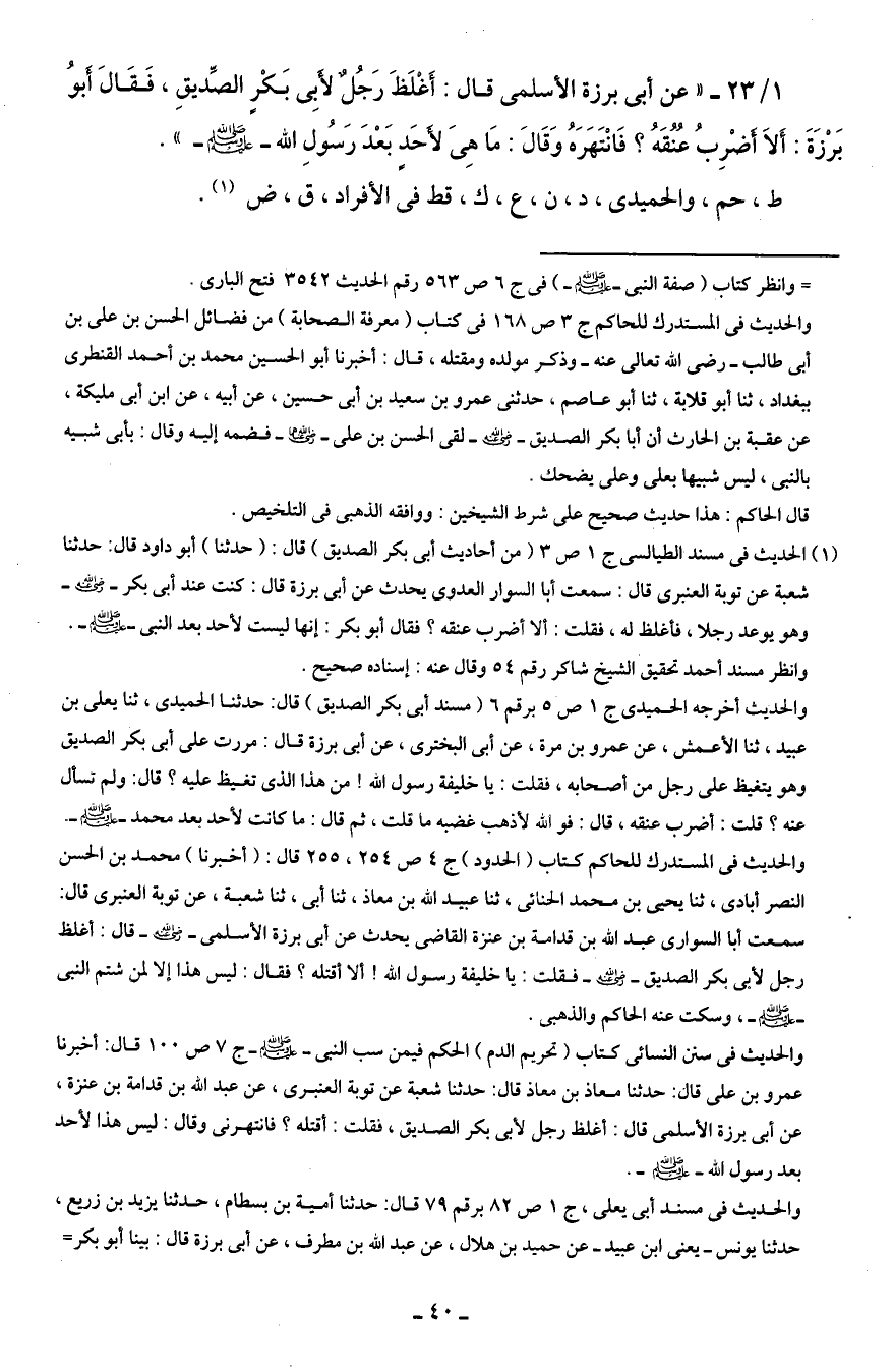 1/ 23 - "عن أبى برزة الأسلمى قال: أَغْلَظَ رَجُلٌ لأَبِى بَكْرٍ الصِّديقِ، فَقَالَ أَبُو بَرْزَةَ: أَلَا أَضْرِبُ عُنُقَهُ؟ فَانْتَهَرَهُ وَقَالَ: مَا هِىَ لأَحَدٍ بَعْدَ رَسُولِ الله - صلى الله عليه وسلم -".