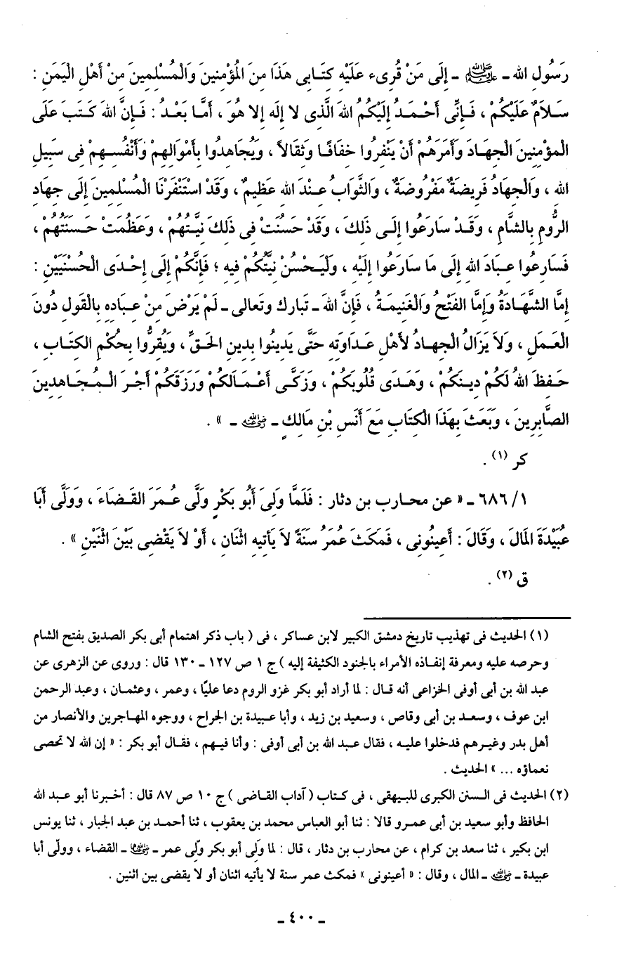 (¬2) الحديث في السنن الكبرى للبيهقى، في كتاب (آداب القاضى) ج 10 ص 87 قال: أخبرنا أبو عبد الله الحافظ وأبو سعيد بن أبى عمرو قالا: ثنا أبو العباس محمد بن يعقوب، ثنا أحمد بن عبد الجبار، ثنا يونس بن بكير، ثنا سعد بن كرام، عن محارب بن دثار، قال: لما وَلِى أبو بكر ولِى عمر- رضي الله عنهما - القضاء، وولّى أبا عبيدة - رضي الله عنه - المال، وقال: "أعينونى" فمكث عمر سنة لا يأتيه اثنان أو لا يقضى بين اثنين.