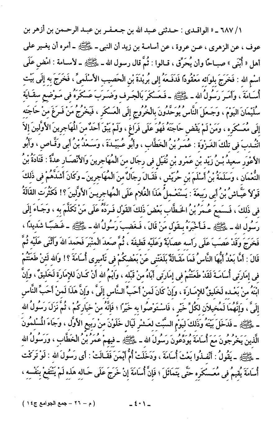 1/ 687 - "الواقدى: حدثنى عبد الله بن جعفر بن عبد الرحمن بن أزهر بن عوف، عن الزهرى، عن عروة، عن أسامة بن زيد أن النبى - صلى الله عليه وسلم - أمره أن يغير على أهل "أُبْنَى" صباحًا وأن يُحَرِّق، قالوا: ثُمَّ قال رسول الله - صلى الله عليه وسلم - لأسامة: امْضِ عَلى اسْمِ اللهِ: فَخَرَجَ بِلِوَائِهِ مَعْقُودًا فدَفَعَهُ إِلى بُريْدَةَ بْنِ الْحَصِيبِ الأَسْلَمِىِّ، فخرَجَ بِهِ إِلى بَيْتِ أُسَامَةَ، وَأَمَرَ رَسُولُ اللهِ - صلى الله عليه وسلم - فَعَسْكَرَ بَالْجَرفِ وَضَرَبَ عَسْكَرَهُ في مَوضِعِ سِقَايَةِ سُلَيْمَانَ اليَوْمَ، وَجَعَلَ النَّاسُ يُوَحَّدُونَ بِالْخُرُوجِ إِلَى العَسْكَرِ، فَيَخْرُجُ مَنْ فَرغَ مِنْ حَاجَتِهِ إِلَى مُعَسْكَرِهِ، وَمَنْ لَمْ يَقْضِ حَاجَتَهُ فَهُوَ عَلَى فَرَاغٍ، وَلَمْ يَبْقَ أَحَدٌ مِنَ المُهَاجِرِينَ الأَوَّلِينَ إِلَا انْتُدِبَ فِى تِلْكَ الغَزْوَةِ: عُمَرُ بْنُ الْخَطَّابِ، وأَبُو عُبَيْدَةَ، وَسَعْدُ بْنُ أَبِى وَقَّاصِ، وَأَبُو الأَعْوَرِ سعِيدُ بْنُ زَيْدِ بْنِ عَمْرو بْنِ نُفَيْلٍ فِى رِجَالٍ مِنَ المُهَاجِرينَ وَالأَنْصَارِ عِدَّةً: قَتَادَةُ بْنُ النُّعْمَانِ، وَسَلَمَةُ بْنُ أَسْلَمَ بْنِ حُرَيْشٍ، فَقَالَ رِجَالٌ مِنَ المُهَاجِرِينَ - وَكَانَ أشَدَّهُمْ فِى ذَلِكَ قَوْلًا عَيَّاشُ بْنُ أَبِى رَبِيعَةَ: يَسْتَعْمِلُ هَذَا الْغُلام عَلَى الْمُهاجِرِينَ الأَوَّلِينَ؟ ! فَكَثُرَتِ القَالَةُ فِى ذَلِكَ، فَسَمِعَ عُمَرُ بْنُ الخَطَّابِ بَعْضَ ذَلِكَ القَوْلِ فَرَدَّهُ عَلَى مَنْ تَكَلَّمَ بِهِ، وَجَاءَ إِلَى رَسُولِ اللهِ - صلى الله عليه وسلم - فَأَخْبَرَهُ بِقَوْلِ مَنْ قَالَ، فَغَضِبَ رَسُولُ اللهِ - صلى الله عليه وسلم - غَضَبًا شَديدًا، فَخَرَجَ وَقَدْ عَصَبَ عَلَى رَأسِهِ عِصَابَةً وَعَليْهِ قَطِيفَة، ثُمَّ صَعِدَ الْمِنْبَرَ فحَمِدَ اللهَ وَأَثْنَى عَلَيْهِ ثُمَّ قَالَ: أَمَّا بَعْدُ أَيُّهَا النَّاسُ فَمَا مَقَالَةٌ بَلَغَتْنِى عَنْ بَعْضِكُمْ فِى تَأمِيرِى أُسَامَةَ؟ ! وَاللهِ لَئِنْ طَعَنْتُمْ فِى إِمَارَتِى أُسَامَةَ لَقَدْ طَعَنْتُمْ فِى إِمَارَتِى أَبَاهُ مِنْ قَبْلِهِ، وَايْمُ اللهِ أَنْ كَانَ للإِمَارَةِ لَخَلِيقٌ، وَإِنَّ ابْنَهُ مِنْ بَعْدِهِ لَخَلِيقٌ للإِمَارَةِ، وَإِنْ كَانَ لَمِنْ أَحَبَّ النَّاسِ إِلَىَّ، وَإِنَّ هَذَا لَمِنْ أَحَبِّ النَّاسِ إِلَىَّ، وَإِنَّهُمَا لَمُخِيلَانِ لِكُلَّ خَيْرٍ، فَاسْتَوْصُوا بِهِ خَيْرًا؛ فَإِنَّهُ مِنْ خِيَارِكُمْ، ثُمَّ نَزَلَ رَسُولُ اللهِ - صلى الله عليه وسلم - فَدَخَلَ بَيْتَهُ وَذَلِكَ ليَوْمِ السَّبْتِ لِعَشْرِ لَيَالٍ خَلَوْنَ مِنْ رَبِيع الأَوَّلِ، وَجَاءَ المُسْلِمُونَ الَّذِينَ يَخْرُجُونَ مَعَ أُسَامَةَ يُوَدَّعُونَ رَسُولَ اللهِ - صلى الله عليه وسلم - فِيِهِمْ عُمَرُ بْنُ الخَطَّابِ، وَرَسُولُ اللهِ - صلى الله عليه وسلم - يَقُولُ: أَنْفِذُوا بَعْثَ أُسَامَةَ، وَدَخَلَتْ أُمُّ أَيْمَنَ فَقَالَتْ: أَى رَسُولَ اللهِ: لَوْ تَرَكْت أُسَامَةَ يُقِيمُ فِى مُعَسْكَرِهِ حَتَّى يَتَمَاثَلَ؛ فَإِنَّ أُسَامَةَ إِنْ خَرَجَ عَلَى حَالِهِ هَذِهِ لَمْ يَنْتَفِعْ بِنَفْسِهِ،
