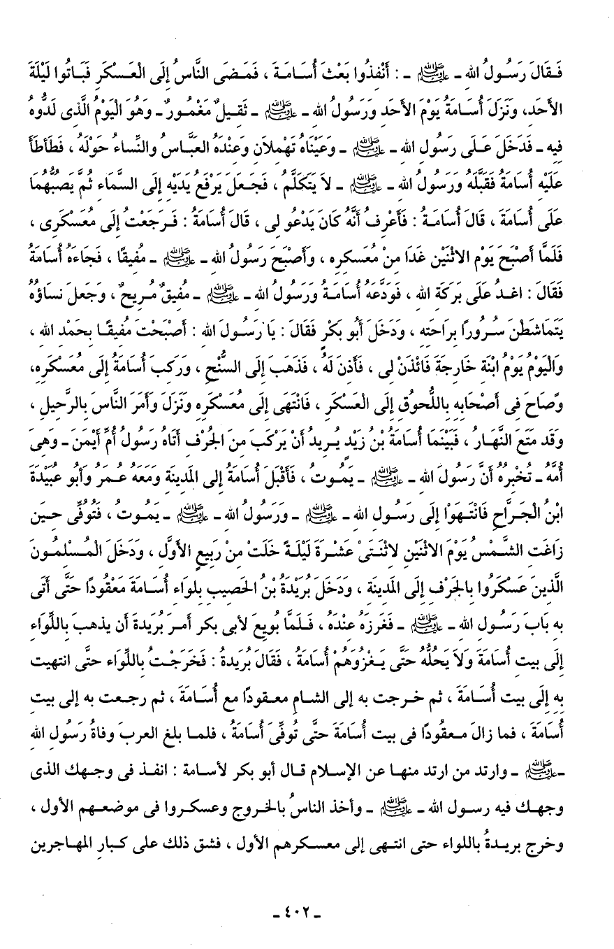 فَقَالَ رَسُولُ اللهِ - صلى الله عليه وسلم -: أَنْفِذُوا بَعْثَ أُسَامَةَ، فَمَضَى النَّاسُ إِلَى الْعَسْكَرِ فَبَاتُوا لَيْلَةَ الأَحَدِ، وَنَزَلَ أُسَامَةُ يَوْمَ الأَحَدِ وَرَسُولُ اللهِ - صلى الله عليه وسلم - ثَقِيلٌ مَغْمُورٌ - وَهُوَ الْيَوْمُ الَّذِي لَدُّوهُ فِيِه - فَدَخَلَ عَلَى رَسُولِ اللهِ - صلى الله عليه وسلم - وَعَيْنَاهُ تَهْمِلَانِ وَعِنْدَهُ العَبَّاسُ والنِّساءُ حَوْلَهُ، فَطَأطَأَ عَلَيْهِ أُسَامَةُ فَقَبَّلَهُ وَرَسُولُ اللهِ - صلى الله عليه وسلم - لَا يَتَكَلَّمُ، فَجَعَلَ يَرْفَعُ يَدَيْهِ إِلَى السَّمَاءِ ثُمَّ يَصُبُّهُمَا عَلَى أُسَامَةَ، قَالَ أُسَامَةُ: فَأَعْرِفُ أَنَّهُ كَانَ يَدْعُو لِى، قَالَ أُسَامَةُ: فَرَجَعْت إِلَى معَسْكَرِى، فَلَمَّا أَصْبَحَ يَوْم الاثْنَيْن غَدَا مِنْ مُعَسكِرِه، وَأَصْبَحَ رَسُولُ اللهِ - صلى الله عليه وسلم - مُفِيقًا، فَجَاءَهُ أُسَامَةُ فَقَالَ: اغدُ عَلَى بَرَكَةِ اللهِ، فَوَدَّعَهُ أُسَامَةُ وَرَسُولُ الله - صلى الله عليه وسلم - مُفِيقٌ مُرِيحٌ، وَجَعلَ نسَاؤُهُ يَتَمَاشَطْنَ سُرُورًا بِرَاحَتِهِ، وَدَخَلَ أَبُو بَكْرٍ فَقَالَ: يَا رَسُولَ اللهِ: أَصْبَحْتَ مُفِيقًا بِحَمْدِ اللهِ، وَالْيَوْمُ يَوْمُ ابْنَةِ خَارِجَةَ فَائْذَنْ لِى، فَأَذِنَ لَهُ، فَذَهَبَ إِلَى السُّنْحِ، وَرَكِبَ أُسَامَةُ إِلَى مُعَسْكَرِهِ، وَصَاحَ فِى أَصْحَابِهِ بِاللُّحوُقِ إِلَى الْعَسْكَرِ، فَانْتَهَى إِلَى مُعَسْكَرِهِ وَنَزَلَ وَأَمَرَ النَّاسَ بِالرَّحِيلِ، وَقَد مَتَعَ النَّهَارُ، فَبَيْنَمَا أُسَامَةُ بْنُ زَيْدٍ يُرِيدُ أنْ يَرْكَبَ مِنَ الجُرْفِ أَتَاهُ رَسُولُ أُمَّ أَيْمَنَ - وَهِىَ أُمَّهُ - تُخْبِرُهُ أَنَّ رَسُولَ اللهِ - صلى الله عليه وسلم - يَمُوتُ، فَأَقْبَلَ أُسَامَةُ إِلى المَدينَةِ وَمَعَهُ عُمَرُ وَأبُو عُبَيْدَةَ بْنُ الْجَرَّاحِ فَانْتَهَوْا إِلَى رَسُولِ اللهِ - صلى الله عليه وسلم - وَرَسُولُ الله - صلى الله عليه وسلم - يَمُوتُ، فَتُوُفِّى حِينَ زَاغَتِ الشَّمْسُ يَوْمَ الاثْنَيْنِ لاِثْنَتَىْ عَشْرَةَ لَيْلَةً خَلَتْ مِنْ رَبِيع الأَوَّلِ، وَدَخَلَ الْمُسْلِمُونَ الَّذِينَ عَسْكَرُوا بِالجَرْف إِلَى المَدِينَةِ، وَدَخَلَ بُرَيْدَةُ بْنُ الحَصِيبِ بِلوَاءِ أُسَامَةَ مَعْقُودًا حَتَّى أَتَى بهِ بَابَ رَسُولِ الله - صلى الله عليه وسلم - فَغَرزَهُ عِنْدَهُ، فَلَمَّا بُوِيعَ لأبى بكر أَمرَ بُرَيدةَ أَن يذهبَ بِاللِّوَاءِ إِلَى بيتِ أُسَامَةَ وَلَا يَحُلُّهُ حَتَّى يَغزُوَهُمْ أُسَامَةُ، فَقَالَ بُرَيدةُ: فَخَرَجْتُ بِاللِّوَاء حتَّى انتهيت بِهِ إِلَى بيت أُسَامَةَ، ثم خرجت به إلى الشام معقودًا مع أُسَامَةَ، ثم رجعت به إلى بيتِ أُسَامَةَ، فما زالَ معقودًا في بيت أُسَامَةَ حتَّى تُوفِّىَ أُسَامَةُ، فلما بلغ العربَ وفاةُ رَسُولِ اللهِ - صلى الله عليه وسلم - وارتد من ارتد منها عن الإسلام قال أبو بكر لأسامة: انفذ في وجهك الذى وجهك فيه رسول الله - صلى الله عليه وسلم - وأخذ الناسُ بالخروج وعسكروا في موضعهم الأول، وخرج بريدةُ باللواء حتى انتهى إلى معسكرهم الأول، فشق ذلك على كبارِ المهاجرين