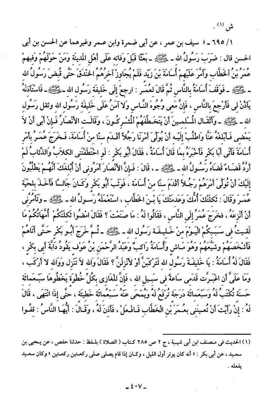1/ 695 - "سيف بن عمر، عن أبى ضمرة وابن عمر وغيرهما عن الحسن بن أبى الحسن قال: ضَرَبَ رَسُولُ اللهِ - صلى الله عليه وسلم - بَعْثًا قَبْلَ وَفاتِهِ عَلَى أَهْلِ المَدِينَةِ وَمَنْ حَوْلَهُمْ وَفِيهمْ عُمَرُ بْنُ اْلخَطَّابِ وَأَمَّرَ عَلَيْهِمْ أسَامَةَ بْنَ زَيْد فَلمْ يُجَاوِزْ آخِرُهُمُ الخنْدَقَ حَتَّى قُبِضَ رَسُول اللهِ - صلى الله عليه وسلم - فَوَقَفَ أُسَامَةُ بِالنَّاسِ ثمَّ قَال لِعُمَر: ارجِعْ إِلَى خَلِيفَةِ رَسُول اللهِ - صلى الله عليه وسلم - فاسْتَأذِنْهُ يَأذَنْ لِى فَأَرْجِعَ بِالنَّاسِ، فَإِنَّ مَعِى وُجُوهَ النَّاسِ وَلا آمَنُ عَلَى خَلِيفَةِ رَسولِ اللهِ - صلى الله عليه وسلم - وثقل رَسُولِ اللهِ - صلى الله عليه وسلم - وَأَثْقَال المُسْلِمِينَ أَنْ يَتَخَطَّفَهُمْ اْلمُشْرِكُونَ، وَقَالَتِ الأَنْصَارُ فَإِنْ أبَى أَنْ لَا يَمْضِى فَأَبْلِغْهُ عَنَّا وَاطْلُبْ إِلَيْهِ أنْ يُوَلِّىَ أَمْرَنَا رَجُلًا أَقْدَم سِنًا مِنْ أُسَامَةَ، فَخَرَجَ عُمَرُ بِأَمْرِ أُسَامَةَ فَأَتَى أَبَا بَكْرٍ فَأَخبَرَهُ بِمَا قَالَ أُسَامَةُ، فَقَالَ أَبُو بَكْرٍ: لَوِ اخْتَطَفْتَنِى الكِلَابُ وَالذِّئابُ لَمْ أَرُدَّ قَضَاءً قَضَاهُ رَسُولُ اللهِ - صلى الله عليه وسلم -، قَالَ: فَإِنَّ الأَنْصَارَ أَمَرُونِى أَنْ أُبلِغَكَ أَنَّهُمْ يَطلُبُونَ إِلَيْكَ أنْ تُوَلَّىَ أُمْرَهُمْ رَجُلًا أَقْدَمَ سِنًا مِنْ أُسَامَة، فَوَثَبَ أَبُو بَكْرٍ وَكَانَ جَالِسًا فَأَخَذَ بِلِحْيَةِ عُمَرَ وَقَالَ: ثَكِلَتْكَ أُمُّكَ وَعَدِمَتْكَ يَا بْنَ الخَطَّابِ، اسْتَعْمَلَهُ رَسولُ اللهِ - صلى الله عليه وسلم - وَتَأمُرُنِى أَنْ أَنْزِعَهُ، فخَرَجَ عُمَرُ إِلَى النَّاسِ، فَقَالُوا لَهُ: مَا صَنَعْتَ؟ فَقَالَ امْضُوا ثَكِلَتْكُمْ أُمَّهَاتُكُمْ مَا لَقِيتُ فِى سَبَبِكُمْ الْيَوْمَ مِنْ خَلِيفَة رَسُولِ اللهِ - صلى الله عليه وسلم - ثُمَّ خَرَجَ أَبُو بَكْرٍ حَتَّى أَتَاهُمْ فَأَشْخَصَهُمْ وشَيَّعَهُمْ وَهُوَ مَاشٍ وَأُسَامَةُ رَاكِبٌ وَعَبْدُ الرَّحْمَنِ بْنُ عَوْفٍ يَقُودُ دَابَّةَ أبِى بَكْرٍ، فَقَالَ لَهُ أُسَامَةُ: يَا خَلِيفَةَ رَسُولِ اللهِ لَتَرْكَبَنَّ أَوْ لأَنْزِلَنَّ؟ فَقَالَ وَاللهِ لَا تَنْزِل وَوَاللهِ لا أَرْكَب، وَمَا عَلَىَّ أَنِ اغْبَرَّت قَدَمِى سَاعةً فِى سَبِيلِ اللهِ، فَإِنَّ لِلْغَازِى بِكُلِّ خُطْوَةٍ يَخْطُوهَا سَبْعَمِائَةِ حَسنَةٍ تُكْتَبُ لَهُ وَسَبْعَمِائَة دَرَجَةٍ تُرْفَعُ لَهُ وَيُمْحَى عَنْهُ سَبْعُمِائَةِ خَطِيئَةٍ، حتَّى إِذَا انْتَهَى، قَالَ لَهُ: إِنْ رأَيْتَ أَنْ تُعينَنِى بعُمَرَ بْنِ الْخَطَّابِ فَافْعَلْ، فَأَذِنَ لَهُ، وَقَالَ: أَيُّهَا النَّاسُ: قِفُوا