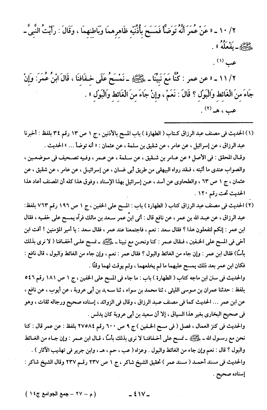 (¬2) الحديث في مصنف عبد الرزاق كتاب (الطهارة) باب: المسح على الخفين، ج 1 ص 196 رقم 763 بلفظ: عبد الرزاق، عن عبد الله بن عمر، عن نافع قال: أتى ابن عمر سعد بن مالك فرآه يمسح على خفيه، فقال ابن عمر: إنكم لتفعلون هذا؟ فقال سعد: نعم، فاجتمعنا عند عمر، فقال سعد: يا أمير المؤمنين! أفت ابن أخى في المسح على الخفين، فقال عمر: كنا ونحن مع نبينا - صلى الله عليه وسلم - نمسح على أخفافنا (لا نرى بذلك بأسًا) فقال ابن عمر: وإن جاء من الغائط والبول؟ فقال عمر: نعم، وإن جاء من الغائط والبول، قال نافع: فكان ابن عمر بعد ذلك يمسح عليهما ما لم يخلعهما، ولم يوقت لهما وقتًا.