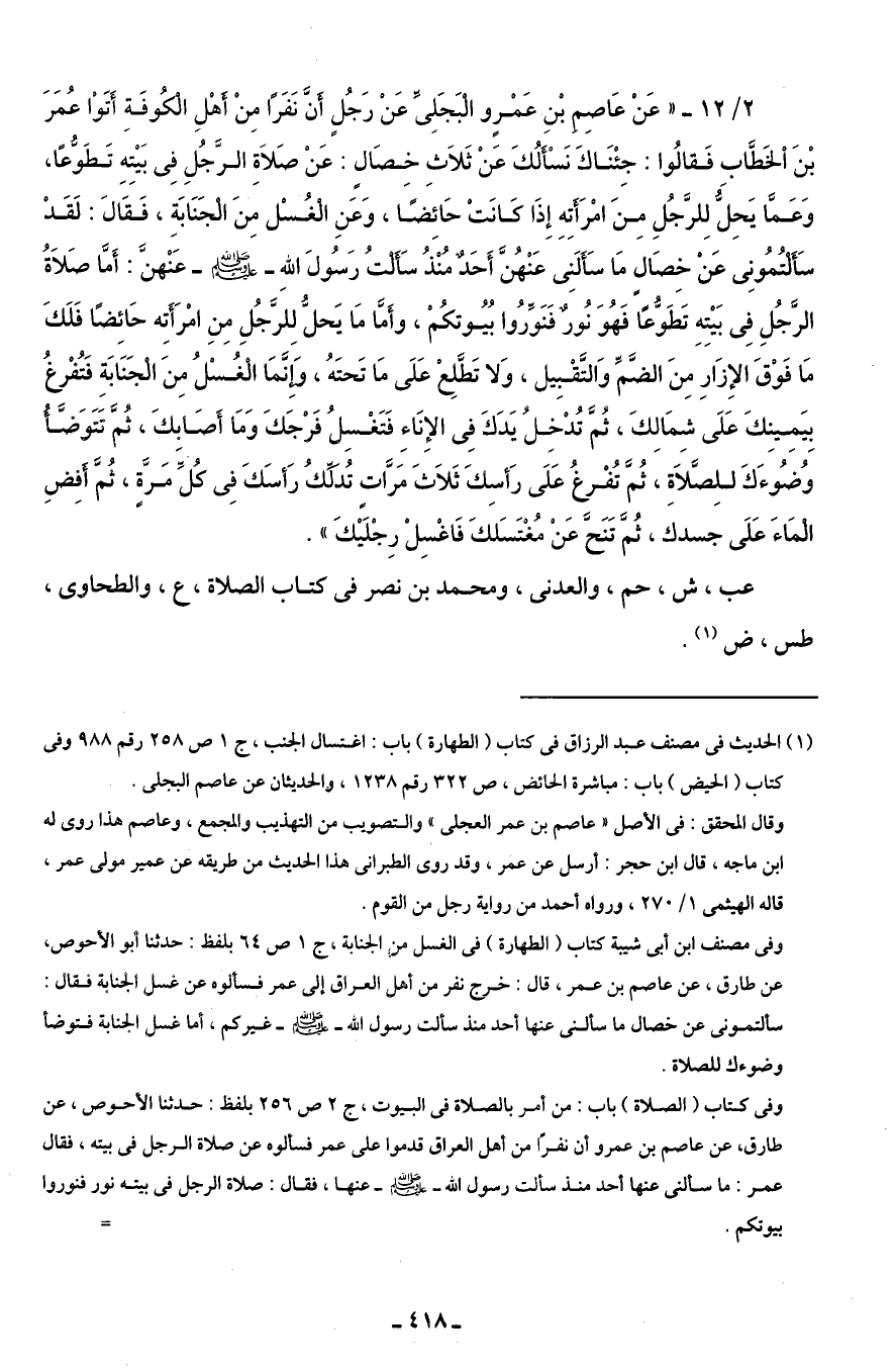 2/ 12 - "عَنْ عَاصِمِ بْنِ عَمْرٍو الْبَجَلِىَّ عَنْ رَجُلٍ أَنَّ نَفَرًا منْ أَهْلِ الْكُوفَةِ أتَوْا عُمَرَ بْنَ اْلخَطَّابِ فَقالُوا: جِئْنَاكَ نَسْأَلُكَ عَنْ ثَلَاثِ خِصَالٍ: عَنْ صَلَاةِ الرَّجُلِ فِى بَيْتِهِ تَطَوُّعًا، وَعَمَّا يَحِلُّ لِلرَّجُلِ مِنَ امْرَأَتِهِ إِذَا كَانَتْ حَائِضًا، وَعَنِ الْغُسْل مِنَ الْجَنَابَةِ، فَقَالَ: لَقَدْ سَأَلْتُمُونِى عَنْ خِصَالٍ مَا سَأَلَنِى عَنْهُنَّ أَحَدٌ مُنْذُ سَأَلْتُ رَسُولَ اللهِ - صلى الله عليه وسلم - عَنْهنَّ: أَمَّا صَلَاةُ الرَّجُلِ فِى بَيْتِهِ تَطَوُّعًا فَهُوَ نُورٌ فَنَوِّرُوا بُيُوتكُمْ، وأَمَّا مَا يَحلُّ لِلرَّجُلِ مِنِ امْرَأَتِه حَائِضًا فَلَكَ مَا فَوْقَ الإِزَارِ مِنَ الضَّمِّ وَالتَّقْبِيل، وَلا تَطَّلِعْ عَلَى مَا تَحتَهُ، وَإِنَّمَا الغُسْلُ مِنَ الْجَنابَةِ فَتُفْرغُ بِيَمِينِكَ عَلَى شِمَالِكَ، ثُمَّ تُدْخِلُ يَدَكَ فِى الإِنَاءِ فَتَغْسِل فَرْجَكَ وَمَا أَصَابك، ثمَّ تَتَوَضَّأُ وضُوءَكَ للِصَّلَاةِ، ثُمَّ تُفْرغُ عَلَى رَأسِكَ ثَلَاثَ مَرَّاتٍ تُدَلَّكُ رَأسَكَ فِى كُلَّ مَرَّةٍ، ثُمَّ أَفِضِ الْمَاءَ عَلَى جسدك، ثُمَّ تَنَحَّ عَنْ مُغْتَسَلكَ فَاغْسِلْ رِجْلَيْكَ".