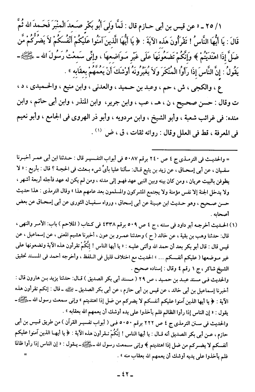 1/ 25 - "عن قيس بن أبى حازم قال: لَمَّا وَلِىَ أَبُو بَكْرٍ صَعِدَ الْمِنْبَرَ فَحَمِدَ الله ثُمَّ قَالَ: يَا أَيُّهَا النَّاسُ! تَقْرَأُونَ هَذِهِ الآيَةَ: {يَاأَيُّهَا الَّذِينَ آمَنُوا عَلَيْكُمْ أَنْفُسَكُمْ لَا يَضُرُّكُمْ مَنْ ضَلَّ إِذَا اهْتَدَيْتُمْ} وَإِنَّكُمْ تَضَعُونَهَا عَلَى غَيْرِ مَوَاضِعِهَا، وإِنِّى سَمِعْتُ رَسُولَ الله - صلى الله عليه وسلم - يَقُولُ: إِنَّ النَّاسَ إِذَا رَأَوُا الْمُنْكَرَ وَلَا يُغَيِّرُونَهُ أَوْشَكَ أَنْ يَعُمَّهُمْ بِعِقَابِهِ".