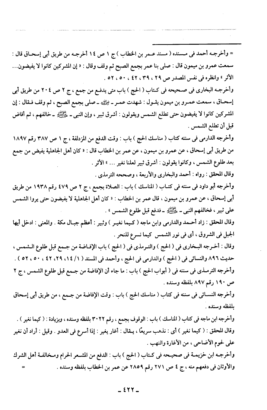 = وأخرجه أحمد في مسنده (مسند عمر بن الخطاب) ج 1 ص 14 أخرجه من طريق أبى إسحاق قال: سمعت عمرو بن ميمون قال: صلى بنا عمر بجمع الصبح ثم وقف وقال: "إن المشركين كانوا لا يفيضون ... الأثر" وانظره في نفس المصدر ص 29، 39، 42، 50، 52.